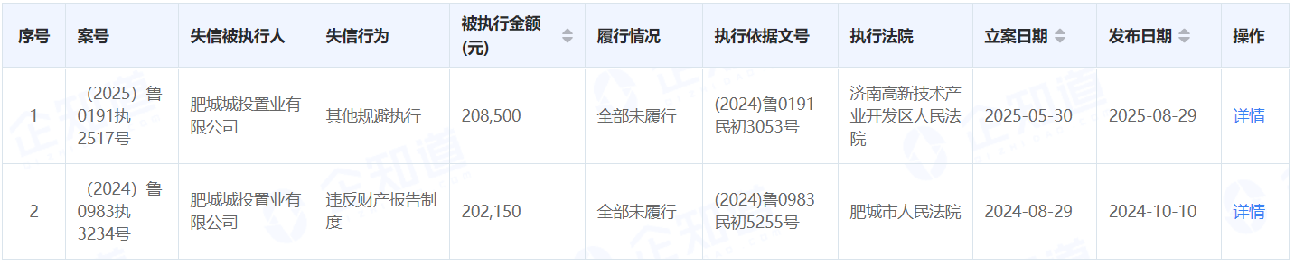 同时,肥城城投置业有限公司先后被肥城市人民法院、济南高新技术产业开发区人民法院列为失信被执行人,执行标的分别为202,150元、208,500元。