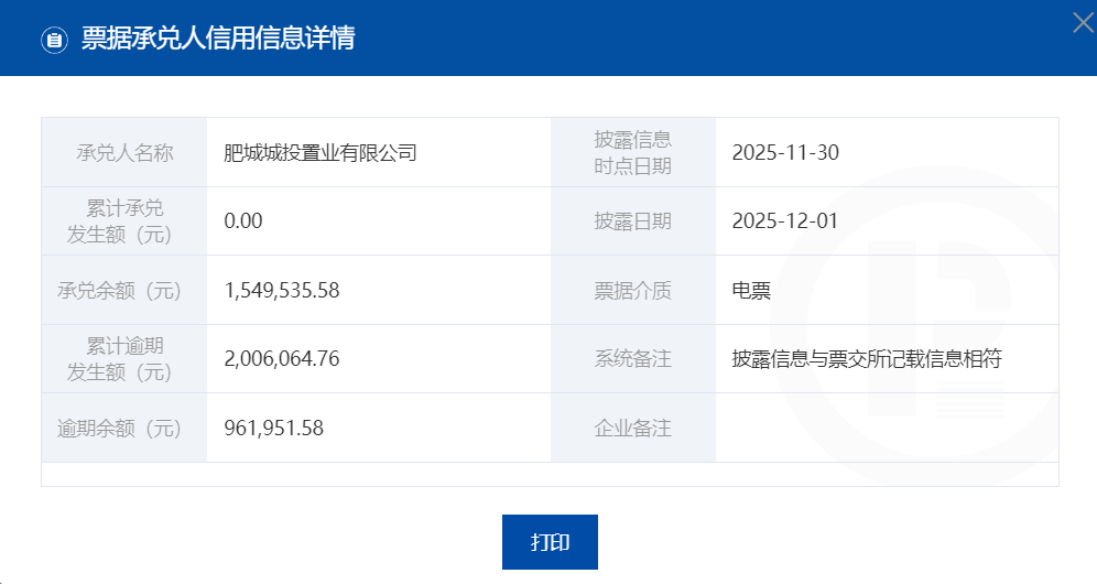 12月5日,上海票据交易所票据信息披露平台发布《截至2025年11月30日承兑人逾期名单》。名单显示,在2025年6月1日至2025年11月30日期间,发生3次以上票据逾期,且月末有逾期余额或当月存在票据逾期行为的承兑人共计735家,肥城城投置业有限公司在列。