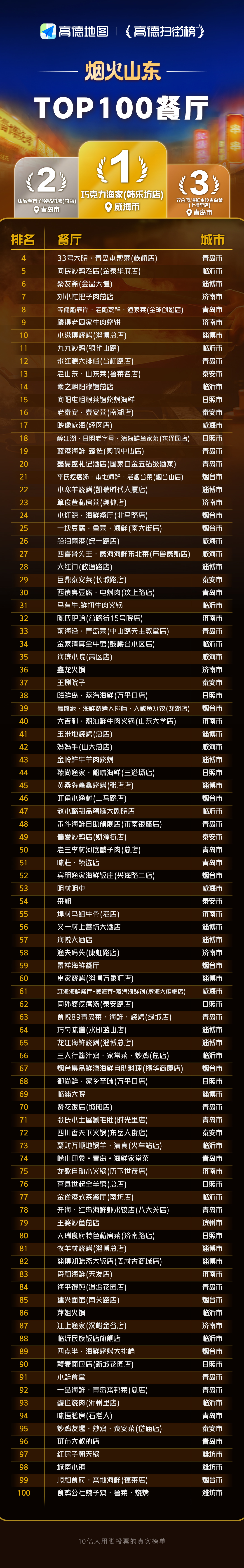 而放眼全省,其他城市亦各具特色,青岛的海鲜、临沂的炒鸡、淄博的烧烤……各地特色美食均有代表上榜,其中威海巧克力渔家(韩乐坊店)、青岛众品老方子锅贴甜沫(总店)和双合园·海鲜水饺青岛菜(上街里店)入围山东TOP100榜单的前三甲,真正实现“走到哪座城,都能吃得好”, 恰恰体现了山东“城城有特色”的烟火气质。