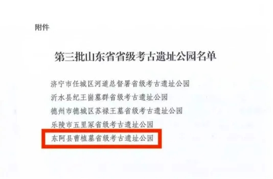 为贯彻落实《国家文物局关于进一步加强考古遗址公园管理工作的通知》及《山东省人民政府办公厅关于进一步加强文物保护利用工作的若干措施的通知》要求,近日,省文化和旅游厅组织开展第三批省级考古遗址公园认定工作。结合专家评审推荐与现场复核情况,聊城市东阿县曹植墓被列入第三批省级考古遗址公园名单。
