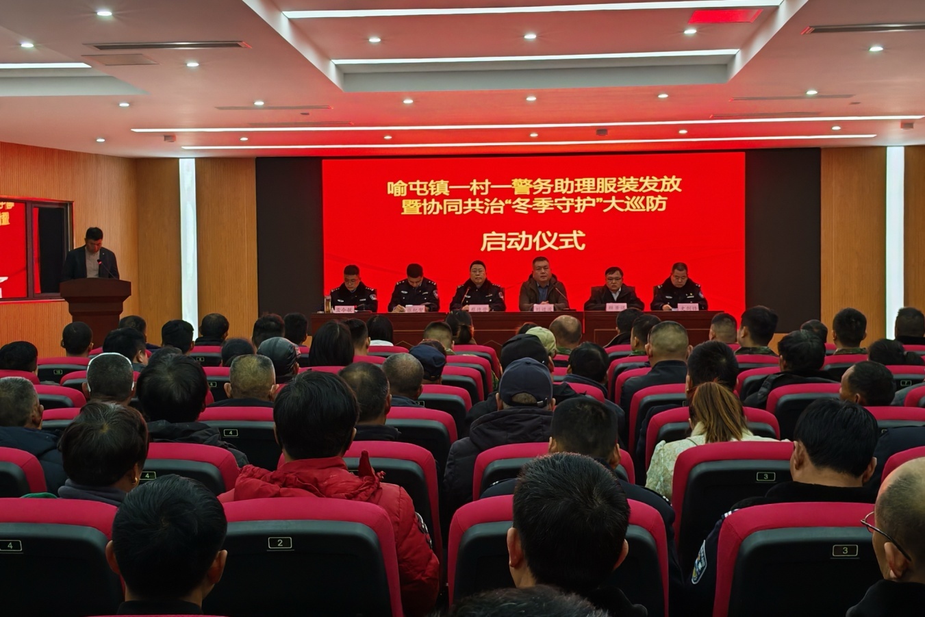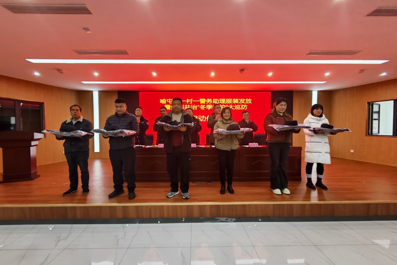 在喻屯镇党群服务中心,12月11日,喻屯镇联合喻屯派出所、东邵派出所举行的一村一警务助理服装发放暨协同共治“冬季守护”大巡防启动仪式的气氛,同样热烈庄重。