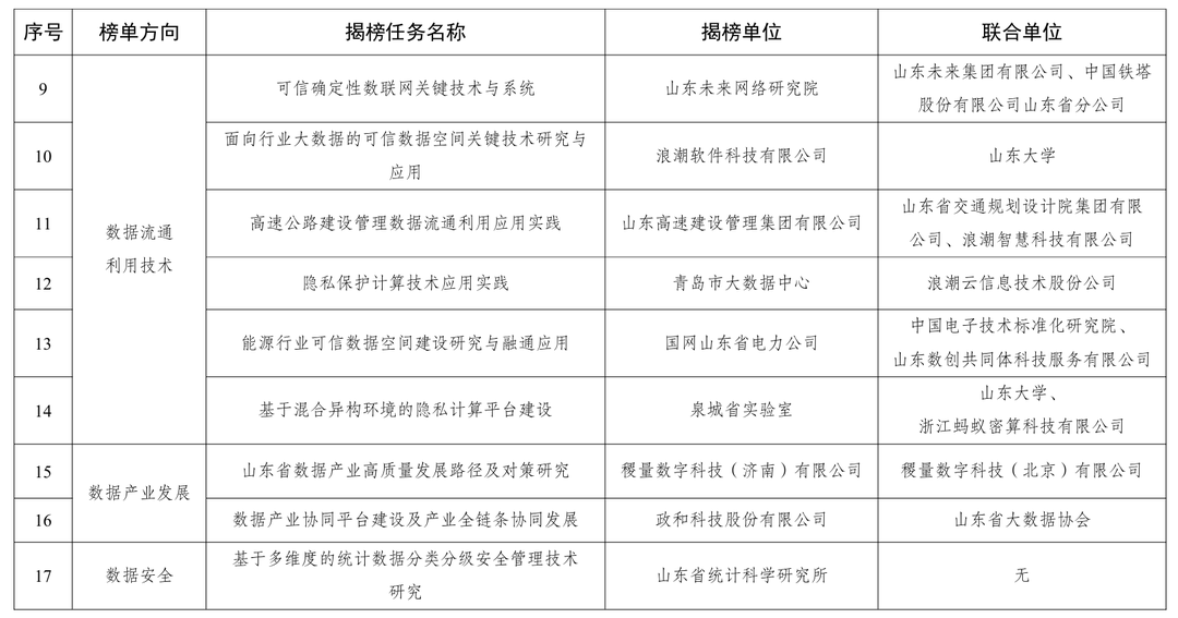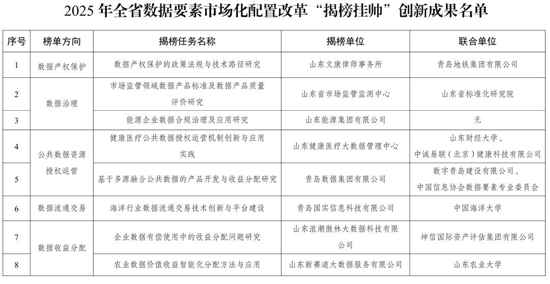 山东省大数据局近日公布2025年全省数据要素市场化配置改革“揭榜挂帅”创新成果名单,17家单位入选。