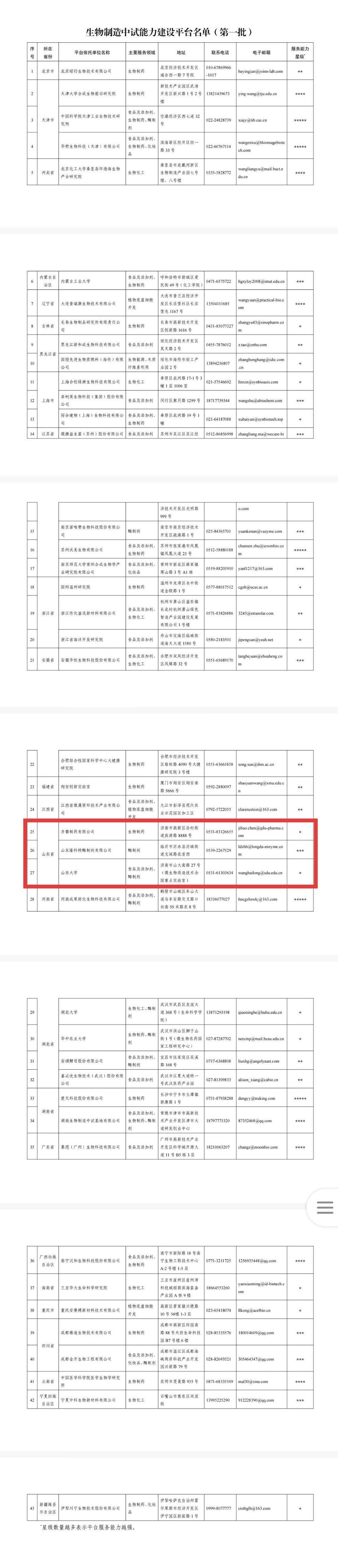 记者从工业和信息化部网站了解到,经省级主管部门推荐、专家评价、面向社会公示等程序,首批生物制造中试能力建设平台名单公布,全国共有43家平台入选,其中山东齐鲁制药有限公司(生物制药方向)、山东隆科特酶制剂有限公司(酶制剂方向)、山东大学(食品及添加剂、酶制剂方向)入选。