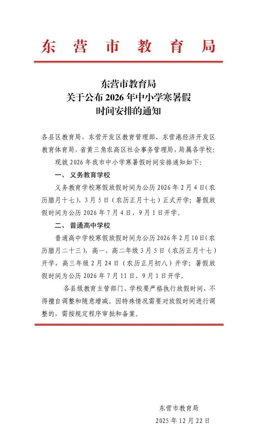 齐鲁网·闪电新闻12月22日讯 2025年12月22日,东营市教育局发布通知,明确2026年全市中小学寒暑假时间安排,要求各级教育主管部门、学校严格执行相关安排。