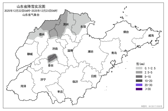 哪些地方降雪了呢?据省气象局统计,22日6时至23日6时,全省共有5市、15县(市、区)出现降雪,平均降雪量0.3(毫米,下同)。各市平均:滨州1.9、德州1.4、泰安1.2、东营0.7和济南0.4,其他市无降雪。降雪量排在前3位的是:泰安泰山6.9、滨州无棣4.1和德州乐陵3.9。