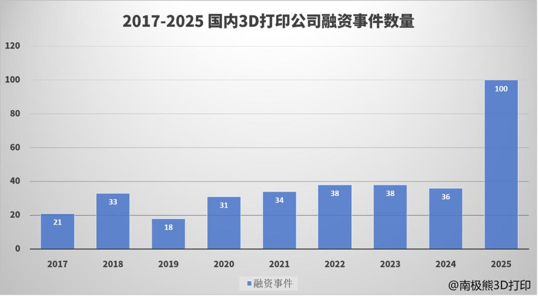 据南极熊3D打印的数据,过去几年,国内3D打印行业投融资事件基本上维持在30-40个之间,而2025年的融资事件直接达到了100个(涉及81家公司,部分公司融资2-3次),翻了快3倍。