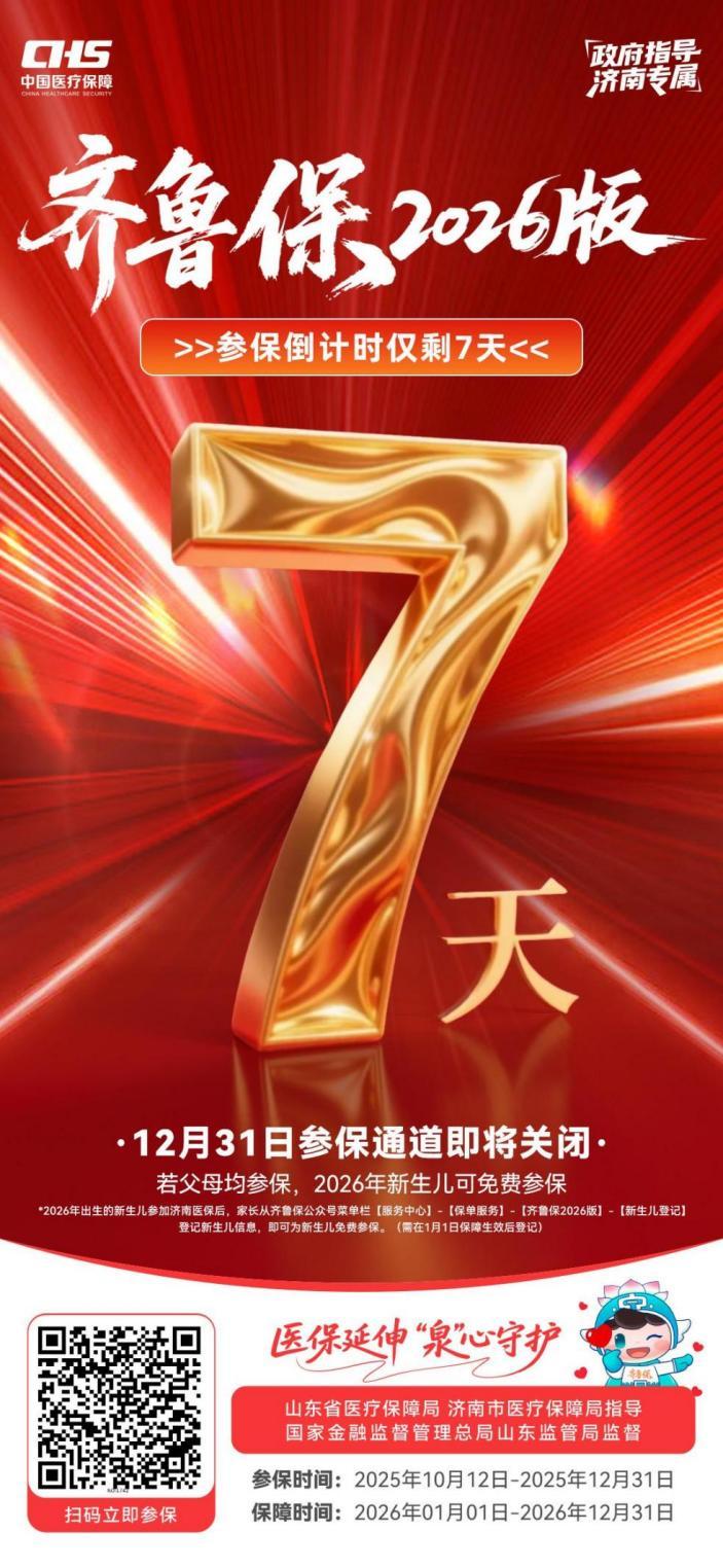 新春将至,健康守护不能缺席。12 月 31 日,参保通道关闭,别让犹豫变成明年的遗憾。这个冬天,让齐鲁保 2026 版与你的家庭同行,用普惠保障守护每一个泉城家庭的岁岁安康,让 2026 年的每一天,都被安心与温暖包裹!