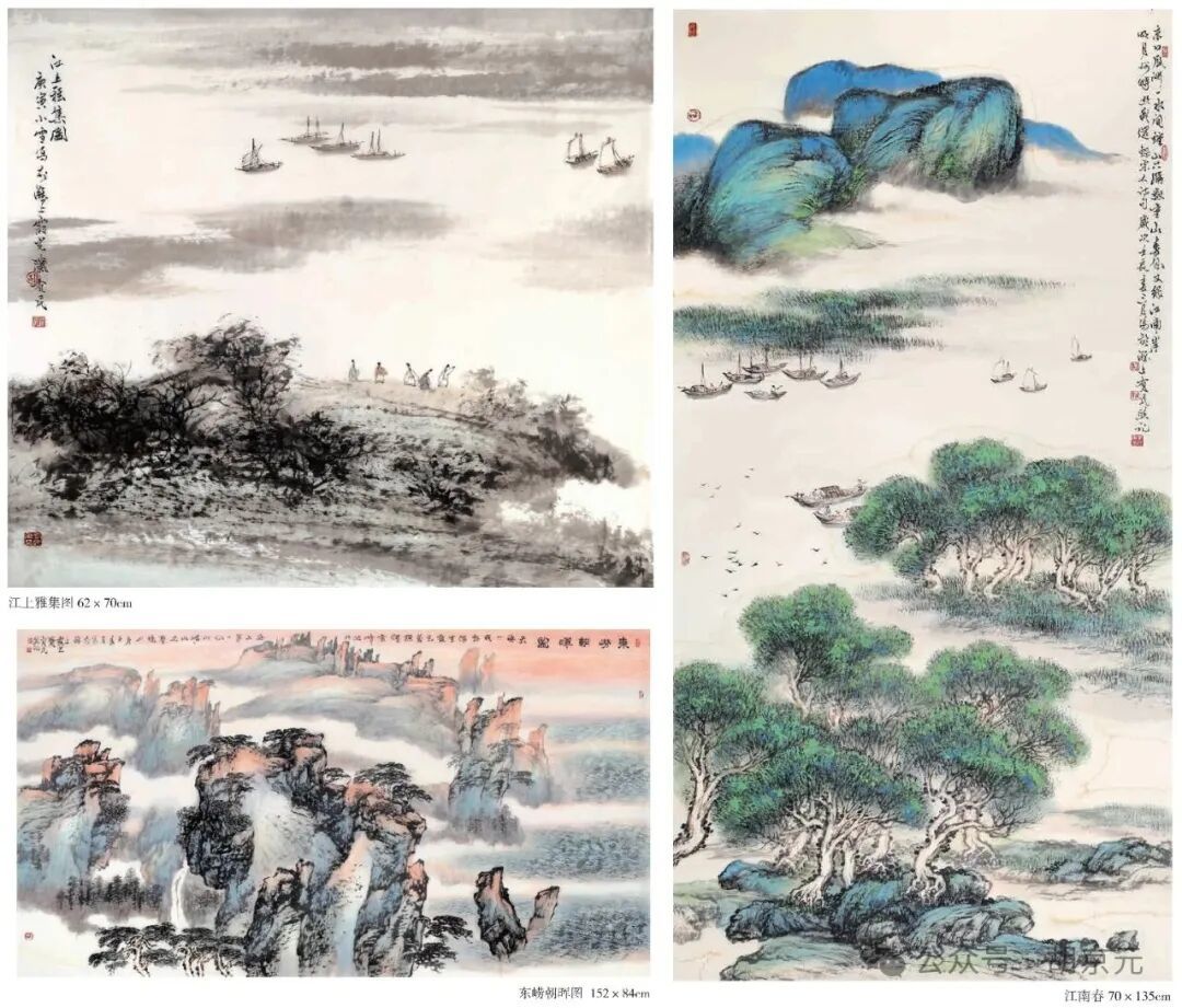 著名美术评论家,前《文艺报》编审主任包立民先生曾多次在不同场合及文章书信中谈及胡有民的艺术风格和创作历程:从早期的“入古”阶段,他沉浸于宋元笔墨,作品以《秋山问道》《万壑松风》为代表,墨色沉厚如古玉,线条劲挺似寒松,尽显传统山水的风骨;中年“出古”时期,他突破程式,将张大千的泼彩、何海霞的金碧与山水的雄浑相结合,创造出“海岱金碧”独特色系,《黄海潮》《泰山日出》《崂山东海》等作品中,石青石绿与朱砂赭石交相辉映,气势磅礴、境高界远。岭南画派大师关山月曾评价他:“技法成熟,很有经验,在中年画家中难得。”何海霞更是以“别有洞天之作”“苍润深厚,气韵尚佳”赞评其艺术成就。这些评价不仅是对他技法的肯定,更是对他“以古为鉴,以今为用”艺术理念的认可。
