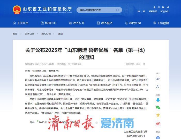 通知称,为认真落实《山东省工贸政策协同一体化行动方案》要求,积极应对国际贸易环境变化,进一步做强国内大循环,推动我省重点产业链企业产品开拓国际国内市场,提升我省制造业品牌影响力,助力产业高质量发展,省工业和信息化厅联合山东省普惠中小企业公共服务中心组织开展了2025年“山东制造 鲁链优品”评价工作。经企业自愿申报、各市初审推荐、专家论证等程序,确定济南和普威视光电技术有限公司的智能红外光电探测系统等508项产品为2025年“山东制造 鲁链优品”。现予公布。