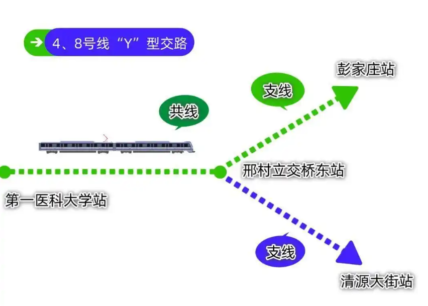 地铁4、8号线及6号线东段以东西走向为主,开通后将实现与一期“H”型的1、2、3号线交织成网,且实现不出站换乘。基于线路分布与沿线客流的差异化特点,4、8号线以“Y”型交路贯通运行,既满足乘客东西向、长距离、快速直达的需求,又灵活交织两线各自的出行需求,方便市民出行。