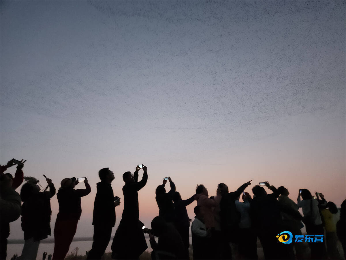 每天日出、日落之时,“鸟浪”观拍点旁的停车场往往“一位难求”。流云般的鸟群,时而出现在天际线处,如纱幔舒展;时而从头顶掠过,似浪涛翻腾。来自新加坡的四口之家慕名而至,正在高中毕业假期中的女儿说:“课本里的画面,此刻全都活了。”从广东来的摄影爱好者刘维恩连连赞叹:“太震撼了!”。近两个月,主要观鸟点接待游客量近40万人次。