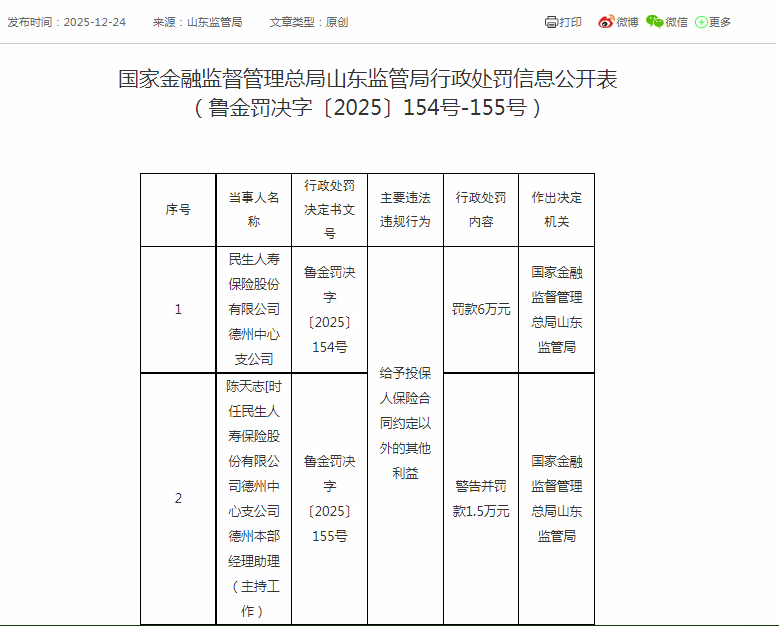 处罚文件(鲁金罚决字〔2025〕154号-155号)显示:民生人寿保险股份有限公司德州中心支公司因给予投保人保险合同约定以外的其他利益,被罚款6万元,时任其德州本部经理助理(主持工作)的陈天志,同时被处以警告并罚款1.5万元。