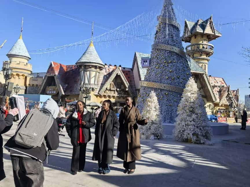 在乐园内卢旺达青年团几名团队成员漫步在这条充满北欧风情的特色街道上,在闪烁的星光吊坠下,同身旁形态各异的小雪人合影,在挂满“积雪”的两侧屋檐等布景中,感受济南融创乐园“心动童话镇”冰雪季的独特浪漫。