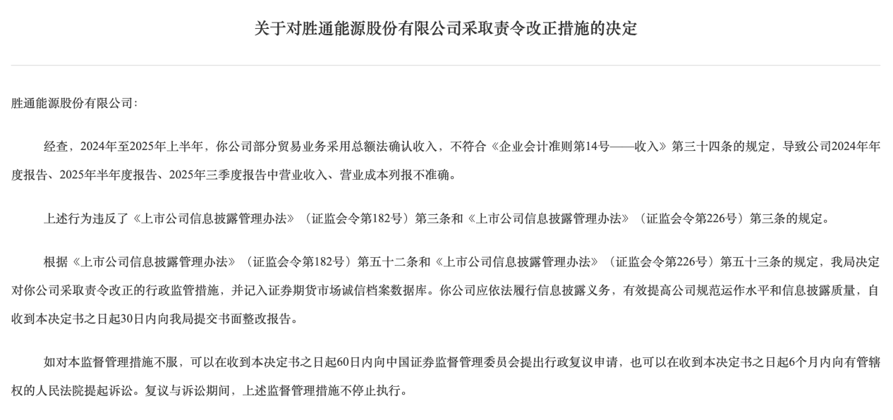 决定书显示,经查,2024年至2025年上半年,胜通能源部分贸易业务采用总额法确认收入,不符合《企业会计准则第14号——收入》第三十四条的规定。这一问题导致公司2024年年度报告、2025年半年度报告及2025年三季度报告中营业收入、营业成本的列报不准确。