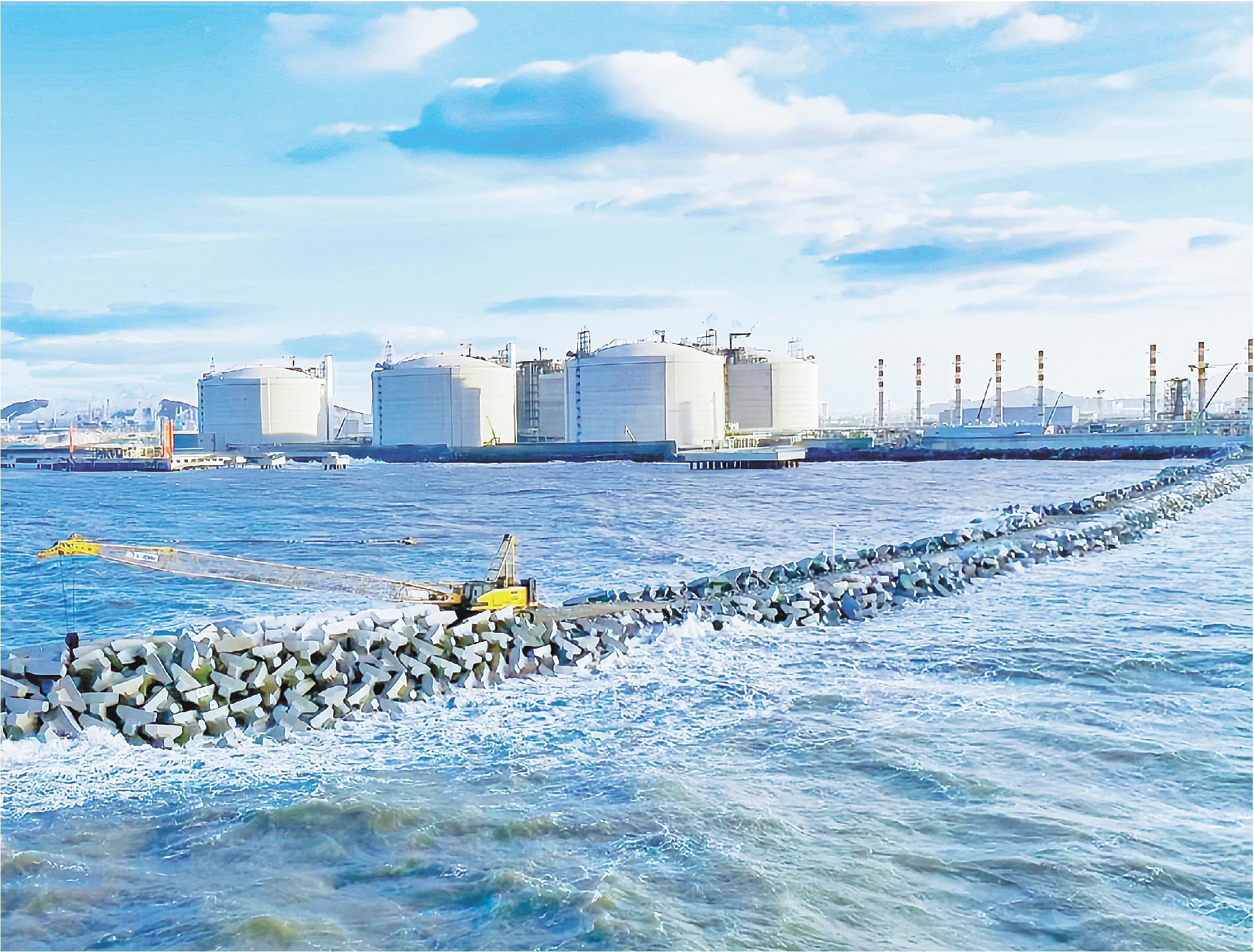 在接收站外围,全长3183.2米的防波堤工程正加速向深海延伸,宛如一道“海上钢铁长城”守护着整个项目。承建单位中交广航局以“百日攻坚”劳动竞赛为抓手,创新管理机制、优化施工方案,持续推动工程建设提质提速。截至目前,防波堤已成功向深海推进523米,其余2660.2米水下进度完成约70%,工程总体进度超过60%。