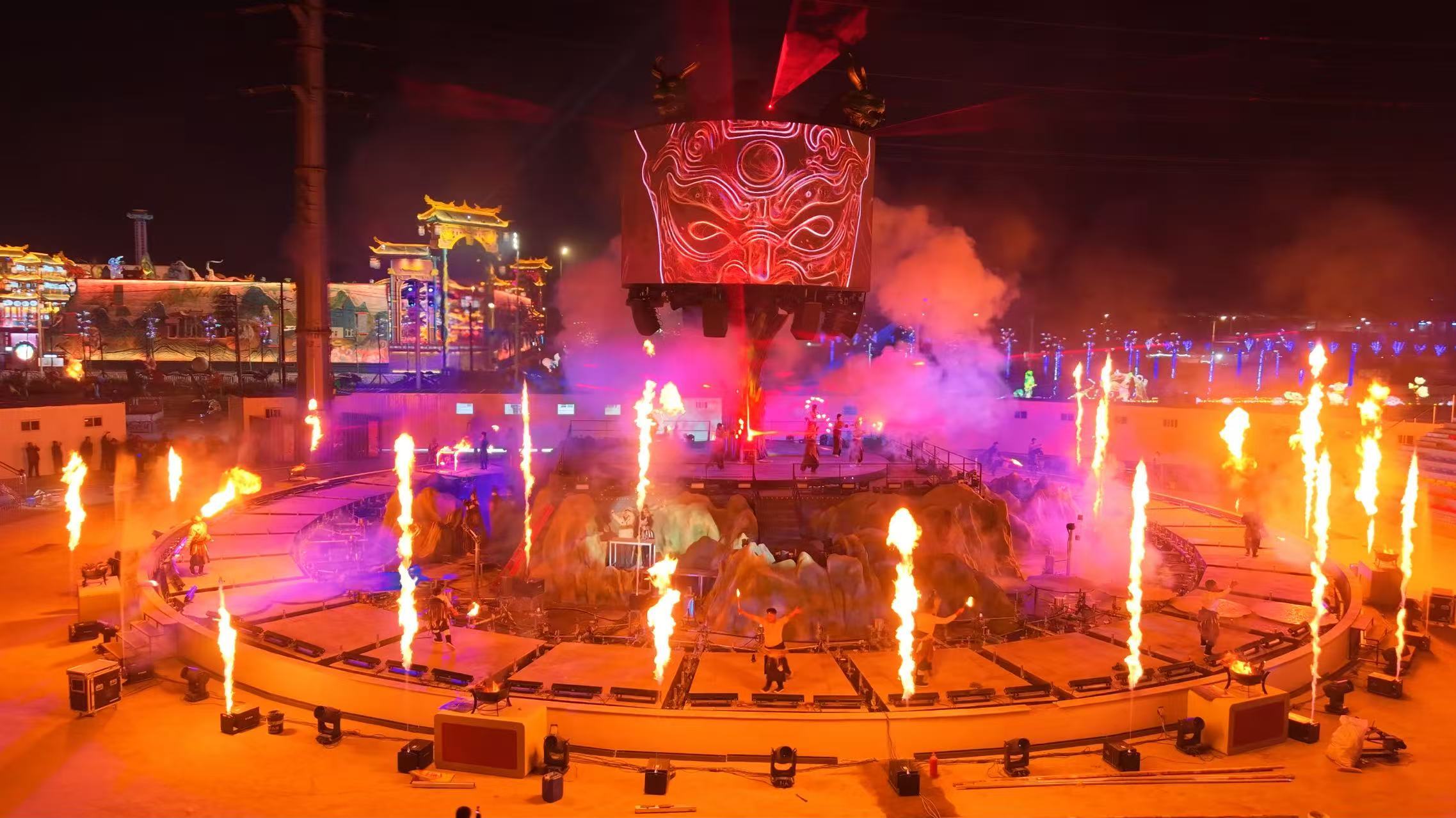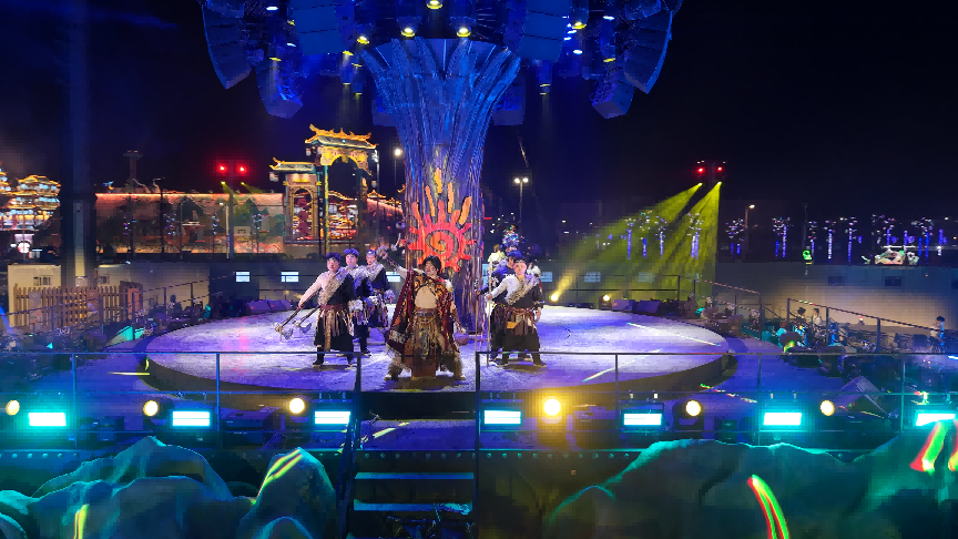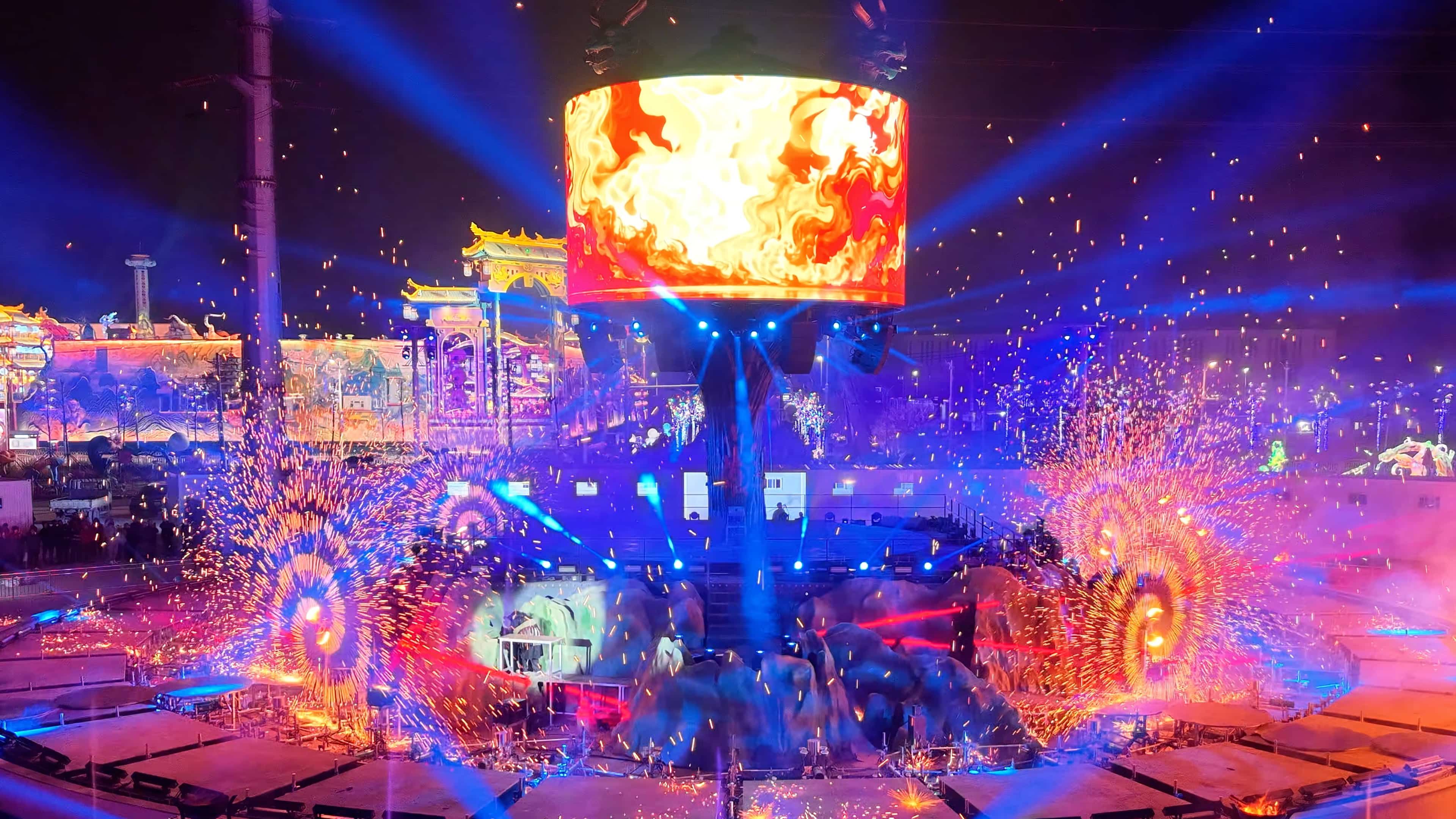 故事中,火种是解冻冰封世界的生命之火,那束穿越黑暗的火种,不仅是物理意义上的光明,也是新世界、新文明、新传承的原始锚点。主创团队运用现代灯光影效,通过舞台灯光效果展现故事背景的迭代节奏,蓝是被冰封住的苍凉大地,红是融化冰川的火种降临,绿是生机勃勃的万物复苏新气象,高饱和度的神话色谱将视觉冲击感拉满,让观众在日常户外实景中沉浸式体验了神话的绮幻魅力。