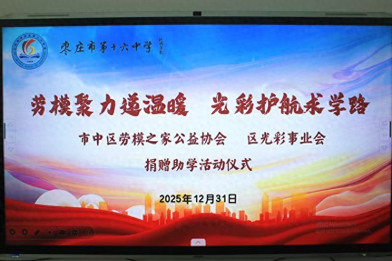寒冬将至,暖意先行。2025年12月31日,枣庄市中区劳模之家公益协会联合区光彩事业促进会带着对青少年成长的深切关怀,走进枣庄市第十六中学,开展“劳模聚力递温暖 光彩护航求学路”助学捐赠活动,为30名家庭经济困难学生送上价值1.5万元的棉衣、棉裤、棉被、手套、围巾等大礼包,用实际行动诠释劳模担当,让这个冬天充满爱与希望。区政府副区长胡少峰,区政协副主席、区工商联主席张兵,区委统战部副部长、区工商联党组书记、常务副主席刘冰,区教体局党组成员、副局长宋亚丽,区劳模之家公益协会会长孔维卓,区劳模之家公益协会荣誉会长武连庆,区劳模之家公益协会秘书长徐蒙恩及枣庄市第十六中学校长孔德军及校领导班子成员参加了捐赠仪式。