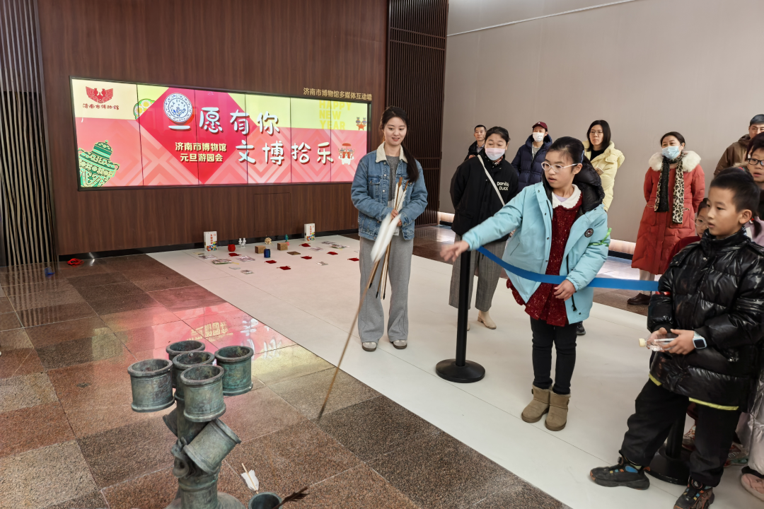 元旦假期,济南市博物馆策划推出“旦愿有你 文博拾乐”元旦主题游园会。除推出“承古启新——中华优秀传统文化中的造物与传心”特展等新展览外,互动区域的活动同样精彩。投壶游戏区还原了古代士大夫宴饮中的礼仪,孩子们凝神静气、巧施腕力,在挑战中感受传统礼仪文化的雅趣。“国宝沙包”互动区则融合了趣味与知识,印有馆藏文物图案的沙包在投掷间翻飞,孩子们在游戏中辨识文物,厚重的历史“活”了起来。