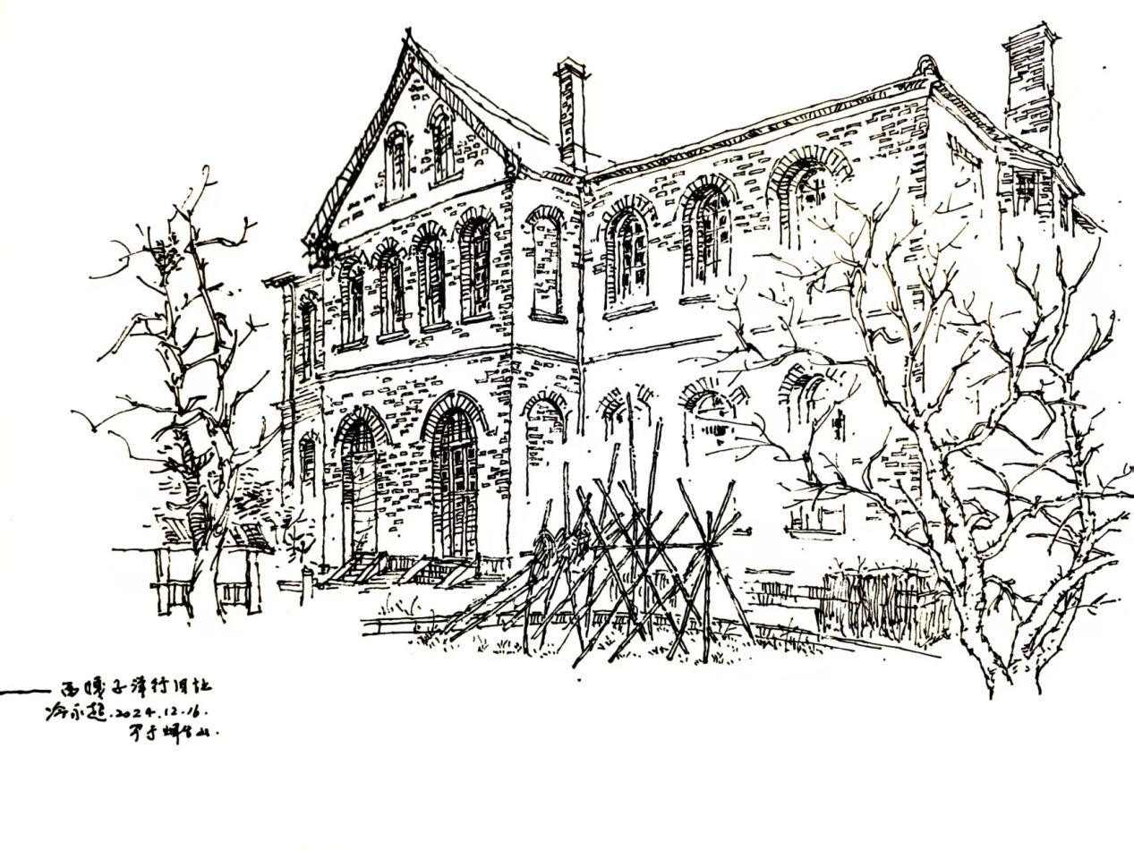 绘画删“减”了环境和背景对建筑的遮掩和障蔽,突出了典型特征。比如,他在西嘎子洋行旧址写生的过程中,洋行前面茂密的树木枝叶,几乎遮掩住建筑正脸的主要特征,为了能完整反映建筑的全貌,他仅仅在画面中象征性地留下几笔疏落的枝叶,删“减”了树木对建筑的障蔽,重点刻画了建筑的主体特征。