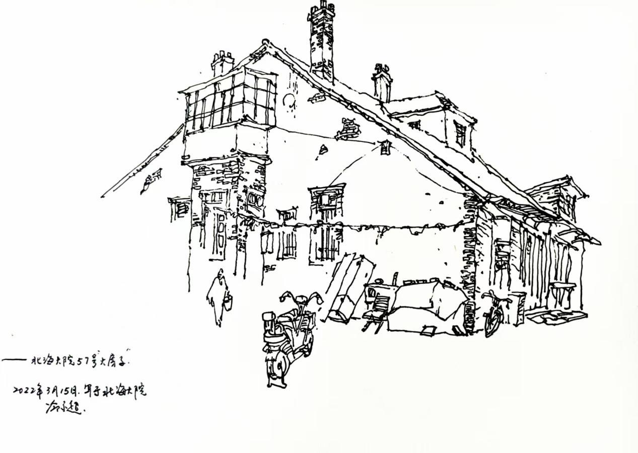 绘画删“减”了建筑图像的非典型特征和“赘笔”。以北海大院里已经拆除的那幢大房子为例,冷永超没有细致刻画建筑繁琐的细节,而是用简练的线条,勾勒出建筑的筋骨与灵魂。他通过对光影的捕捉,借助阳光在老墙上投下的斑驳,让画面变得可视可感。这种以简驭繁的能力,恰如这个删繁就简的秋天,褪去所有浮华,直抵本质。(借用烟台籍在国外定居的王文韬先生评语)
