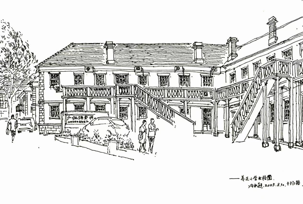 绘画删“减”了建筑本体改造和变化的细节,保持了原有韵味。历史变迁和城市改造自然会改变老建筑的外貌,比如,大家现在看到的养正小学建筑外观,是加装了铝合金玻璃廊道的,而冷永超画笔下的养正小学,却是他凭借少时记忆复原了初始样貌。许多烟台市民看过该作品,异口同声说道:“对,原来就是这个样子”。