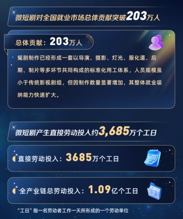 随着产业精品化发展,短剧制作已形成标准化用工体系。剧组规模通常为60—90人,岗位覆盖导演、摄影、灯光、服化道、制片、录音及场务等环节。《报告》测算,微短剧产生直接劳动投入约3685万个工日,全产业链总劳动投入1.09亿个工日。