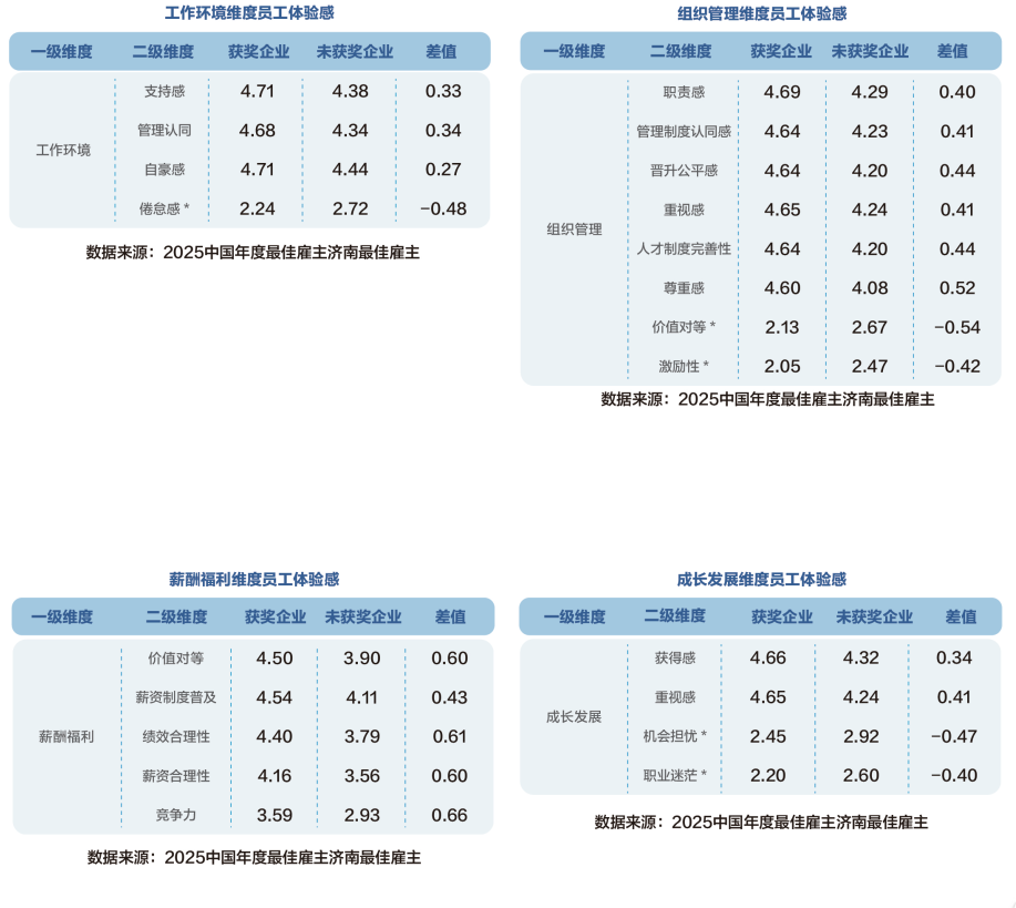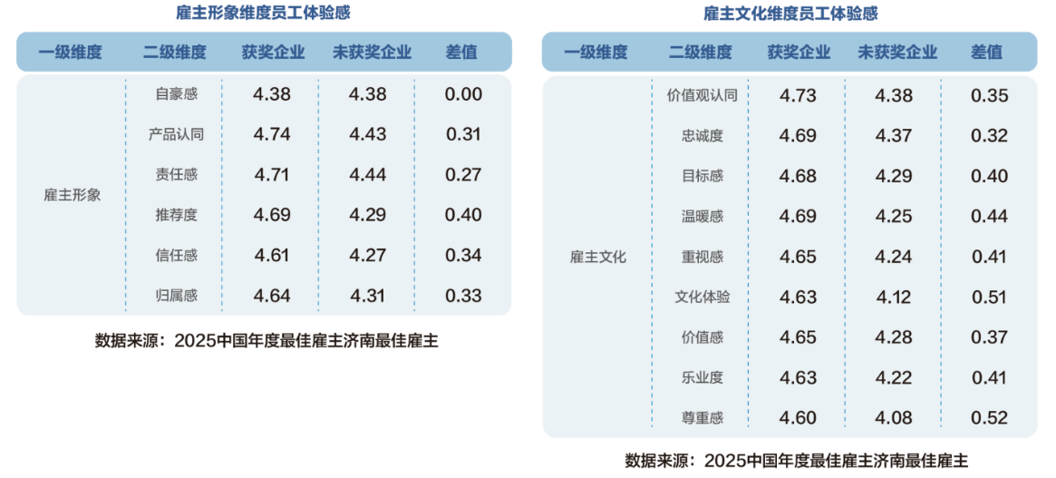 从济南获奖企业的雇主品牌表现数据来看,雇主形象和雇主文化是得分突出的两大维度。相对而言,获奖企业在“薪酬福利”“雇主文化”和“组织管理”这三方面的领先优势更加明显,未获奖企业在“成长发展”、“工作环境”和“雇主形象”三个方面得分与获奖企业的差距较小。可见,获奖企业为员工提供了更优的薪酬福利并且有着更优秀的企业文化与企业管理制度,相应地,未获奖企业应在这两方面投入更多资源,弥补短板,提升企业形象和人才吸引力,从而加强员工对雇主品牌的认同。