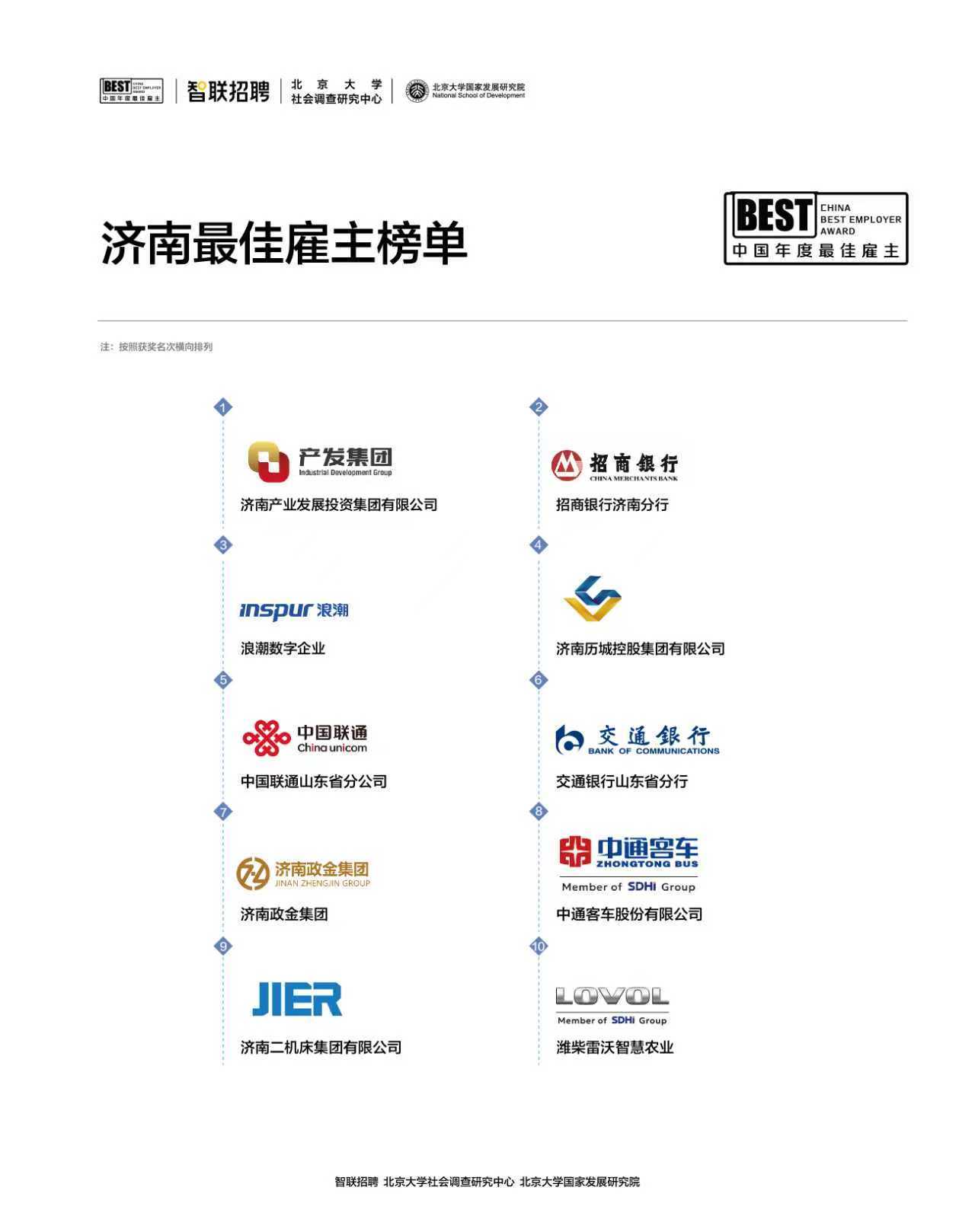 2026新年伊始,“人机共生·智启未来”2025中国年度最佳雇主济南地区10强获奖名单公布。本次评选过程中,济南地区共1047家企业报名,经过角逐产生最终10强名单。济南产业发展投资集团有限公司,招商银行济南分行,浪潮数字企业,济南历城控股集团有限公司,中国联通山东省分公司,交通银行山东省分行,济南政金集团,中通客车股份有限公司,济南二机床集团有限公司,潍柴雷沃智慧农业科技股份有限公司共10家企业入选2025年度济南地区最佳雇主。