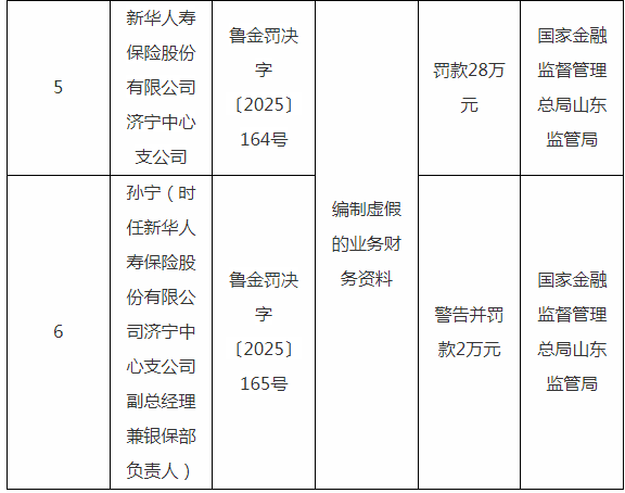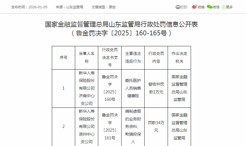 1月5日,国家金融监督管理总局山东监管局对外发布行政处罚信息公开表(鲁金罚决字〔2025〕160-165号),涉及新华人寿保险股份有限公司济南中心支公司、滨州中心支公司、济宁中心支公司及其相关责任人。