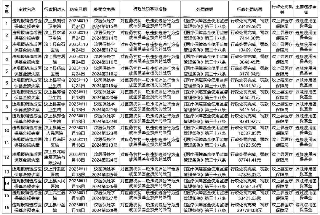 近日,汶上县医疗保障局公示了2025年下半年对县域内定点医疗机构违规使用医保基金的行政处罚信息,其中,汶上县人民医院因违规报销造成医保基金损失被处以402661.39元的罚款。