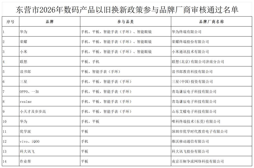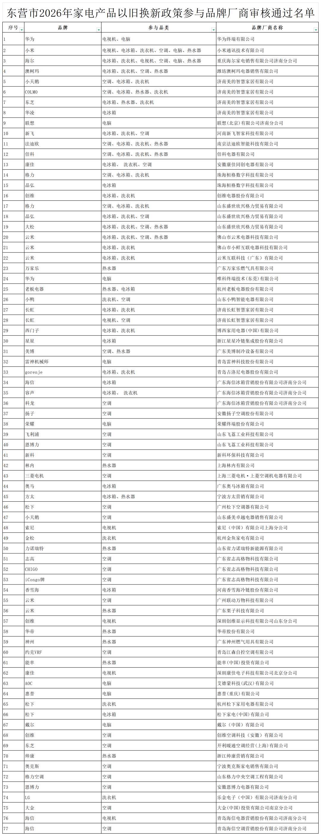 齐鲁网·闪电新闻1月13日讯 为贯彻落实消费品以旧换新工作部署,根据《关于征集东营市2026年家电和数码产品购新活动品牌厂商的通知》要求,东营市商务局组织第三方审核机构对各厂商报名材料进行了审核,现将审核通过名单予以公示。