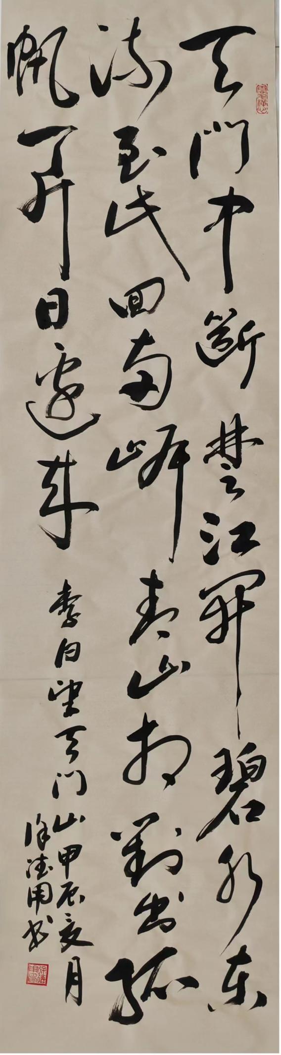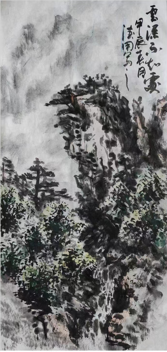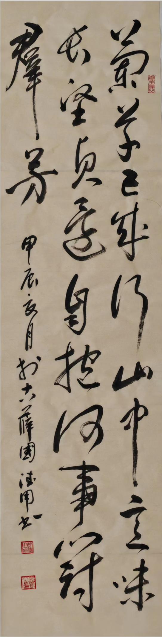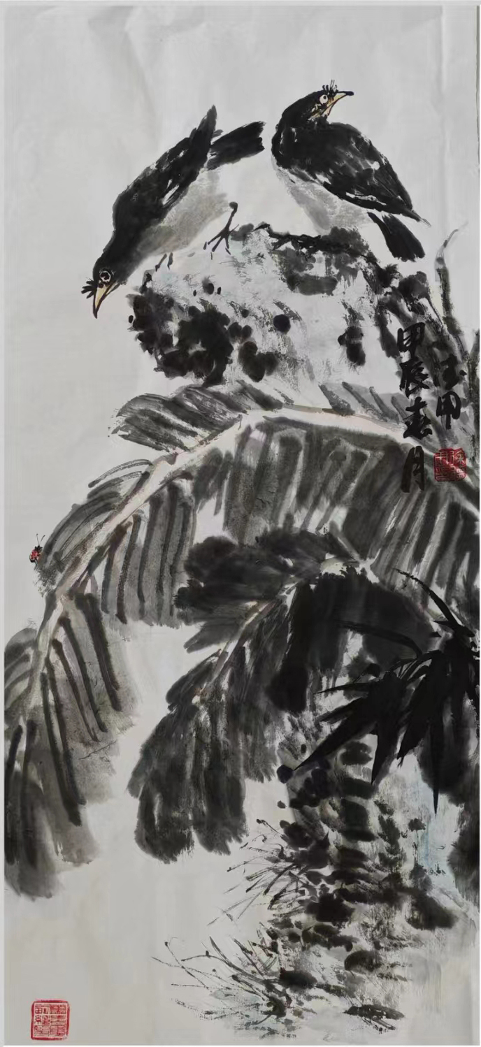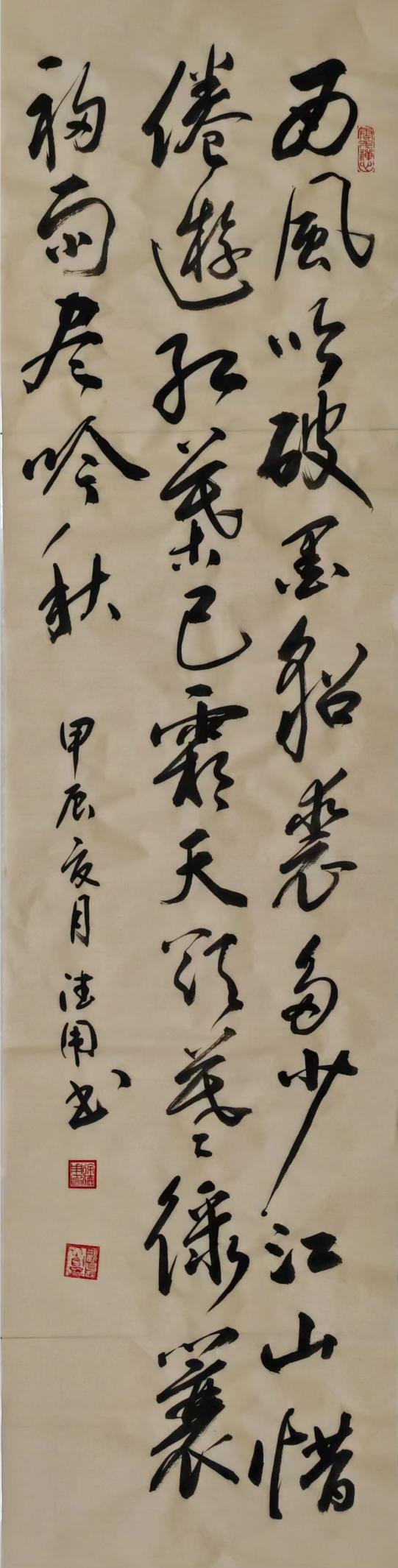 之后的十多年里,和徐德作先生老兄少弟般的忘年之交未曾间断,只是没能得赏他的书画新作,以为憾事。直到2024年春节回乡省亲,再一次见到徐德用先生,才又一次看到他的书画新作,不由得惊叹他的新作脱胎换骨似的嬗变,艺术水准之高,果然不凡。印象深刻的是他的几幅草书作品,线条不受拘束,自然流畅,字体结构和笔画形态变化丰富,意境深远;笔力雄健,极富弹性和张力,章法布局合理,疏密得当,字与字之间、行与行之间相互呼应,形成了一种和谐的整体美感;巧妙运用提按和徐急的变化,使作品的线条更加生动有趣;合理安排章法布白,作品的空间更加开阔和自由。他的作品深得草书法度,师古而不泥古,给人以强烈的视觉冲击,具有独特的艺术风格和审美价值。