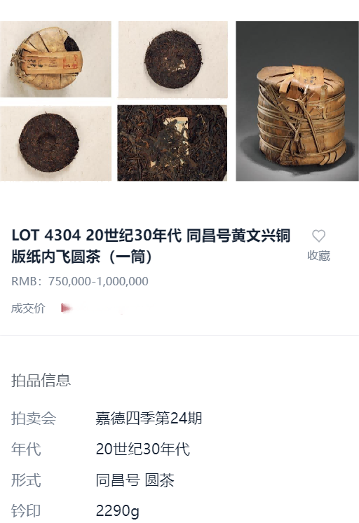 在普洱茶的历史中,“同昌号”是响当当的名字。作为清代易武六家商号之一、“号级茶”的核心代表,它曾以宫廷贡茶的荣耀、独树一帜的茶味,在茶马古道上留下了深刻的印记。2025年,嘉德四季第24期拍卖会上,20世纪30年代同昌号黄文兴铜版纸内飞圆茶(一筒)经过多次角逐,最终以人民币84万落槌。如今,这份传奇在易武同昌黄记的坚守中延续。