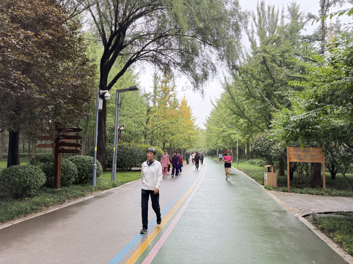 作为全市“万米公园智慧健身步道”的样板段,济南森林公园智慧健身步道总长2300米,采用水性MMA防滑树脂稀浆封层工艺精心铺设,整体色调以灰绿融合为主,在中间巧妙嵌入红黄蓝三色的彩色线条,营造出清新自然又不失沉稳的视觉感受。绿道沿线设置了智能数据采集设备、AI智能识别互动大屏和识别摄像头,漫步其中,市民游客能够随时感受共享智能健身带来的健康与乐趣。