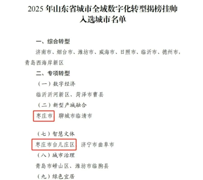 近日,山东省大数据局公布了《山东省城市全域数字化转型揭榜挂帅入选城市名单》,枣庄市市本级成功入选“新型产城融合”专项转型,台儿庄区成功入选“智慧文体”专项转型。