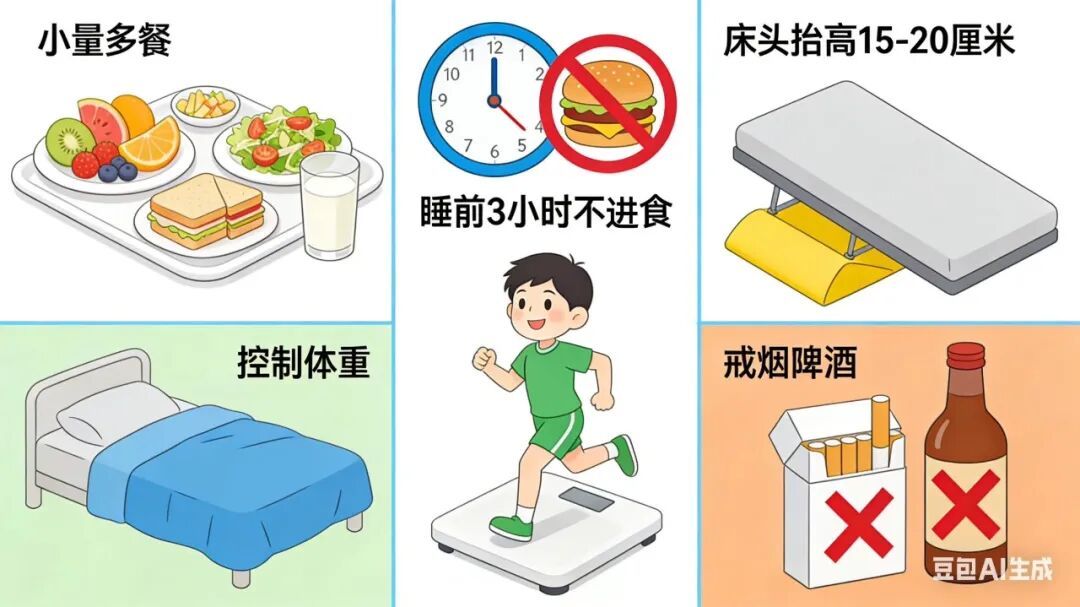 轻度反流可以先从调整生活习惯入手:少量多餐、睡前3小时不进食、床头抬高15-20厘米、控制体重、戒烟戒酒。