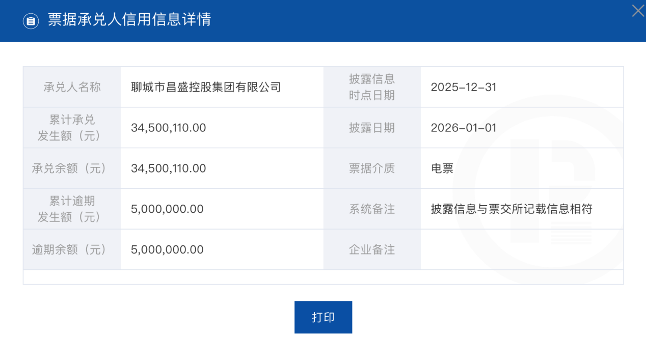 1月9日,上海票据交易所公开披露了截至2025年12月31日的承兑人逾期名单,聊城市昌盛控股集团有限公司(以下简称“聊城昌盛控股”)在列。