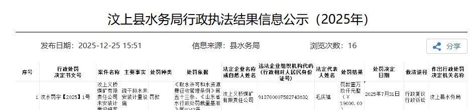 2025年12月25日,汶上县人民政府发布汶上县水务局行政执法结果信息公示(2025年),显示汶上义桥煤矿因疏干排水未安装计量设施被罚19000元,行政处罚决定书文号为汶水罚字〔2025〕1号。