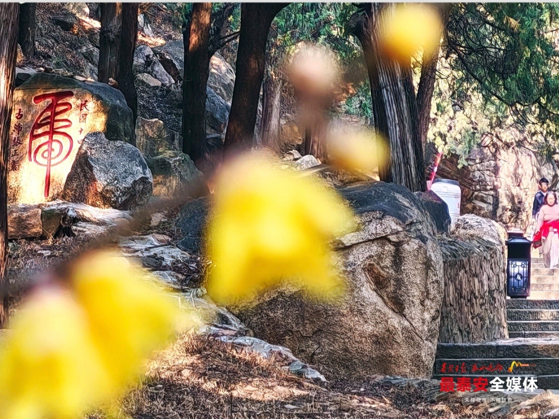 近日,泰山万仙楼北,新植的大花虎蹄蜡梅凌寒绽放。蜡梅与盘道旁一方民国年间的“虎”字石刻相邻,引得游人驻足欣赏。