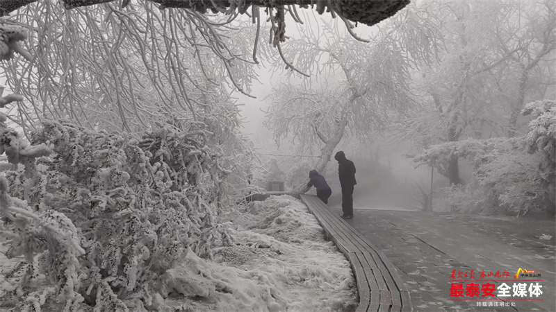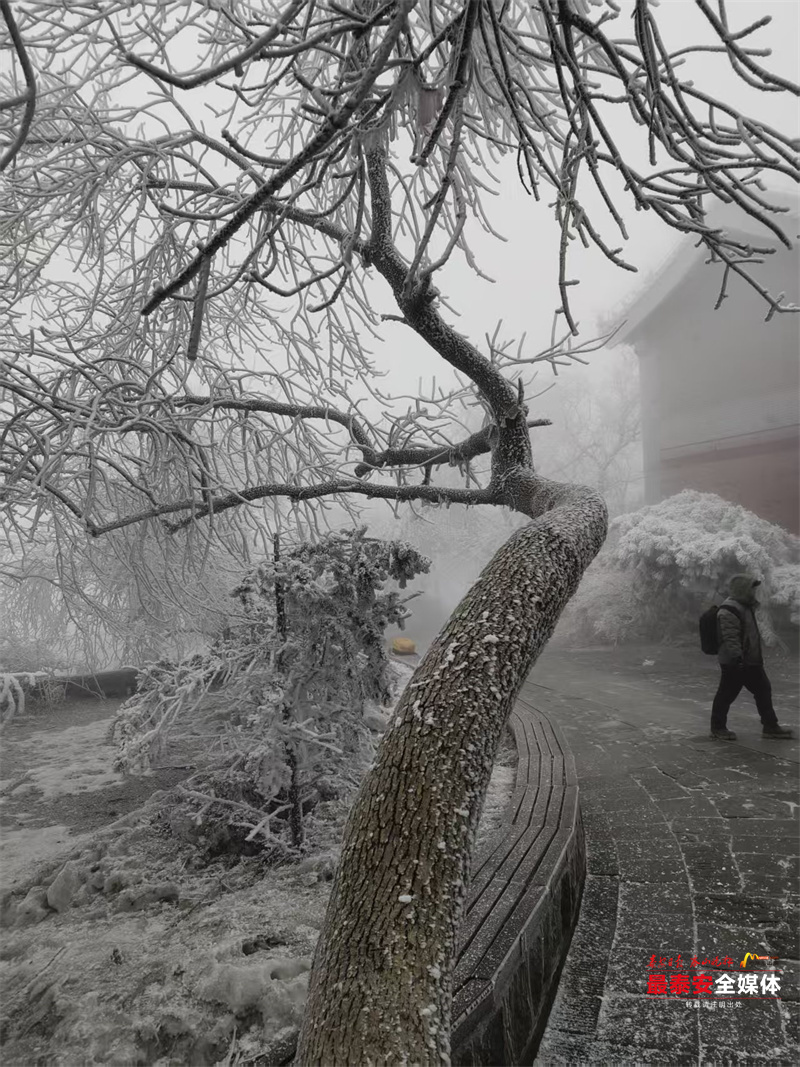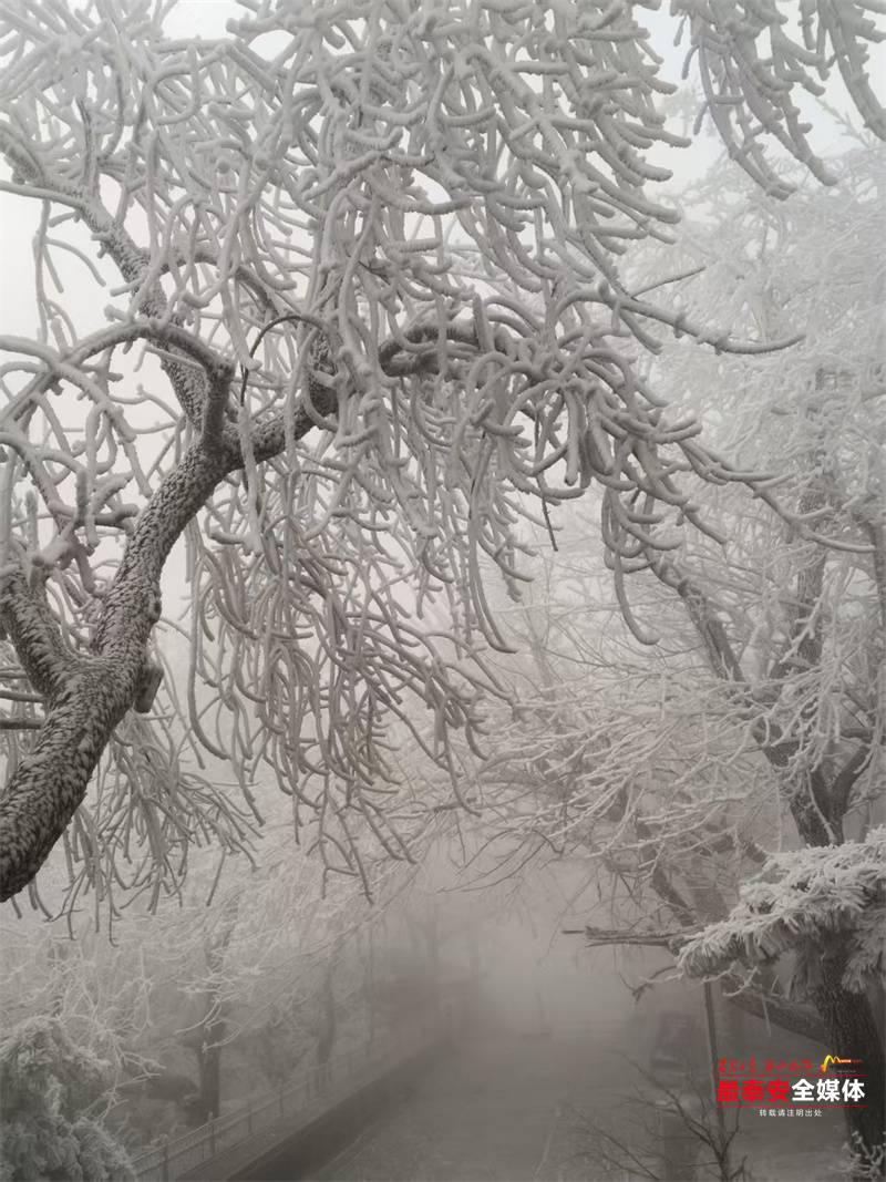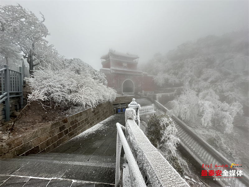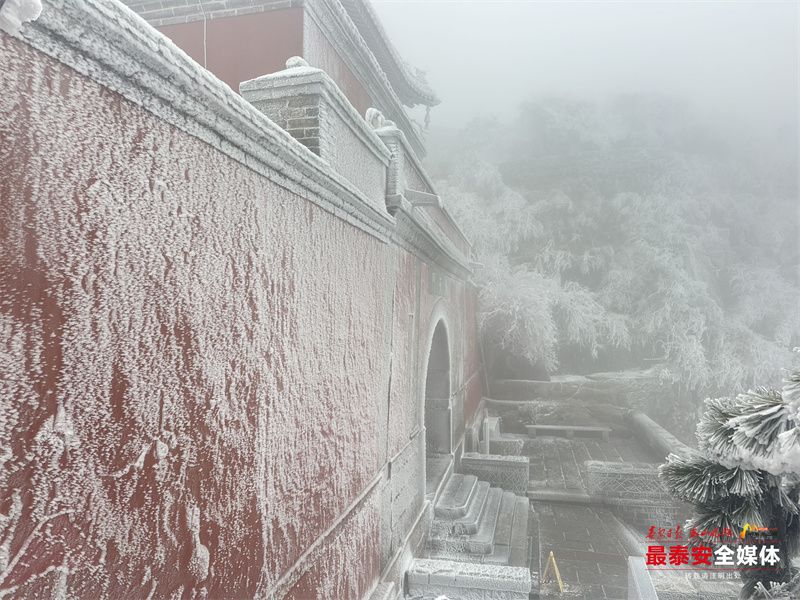 清晨时分,泰山被茫茫云雾笼罩。漫山遍野的树木、石阶乃至红墙古建,皆被冰层与霜花层层包裹,呈现出“千树万树梨花开”的壮丽景象,琼枝玉树,银装素裹。其间,红墙黛瓦的古建筑在冰雪的映衬下,更显古朴与厚重。
