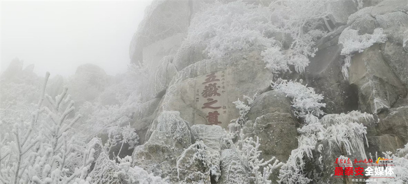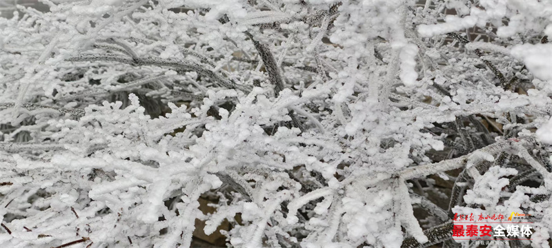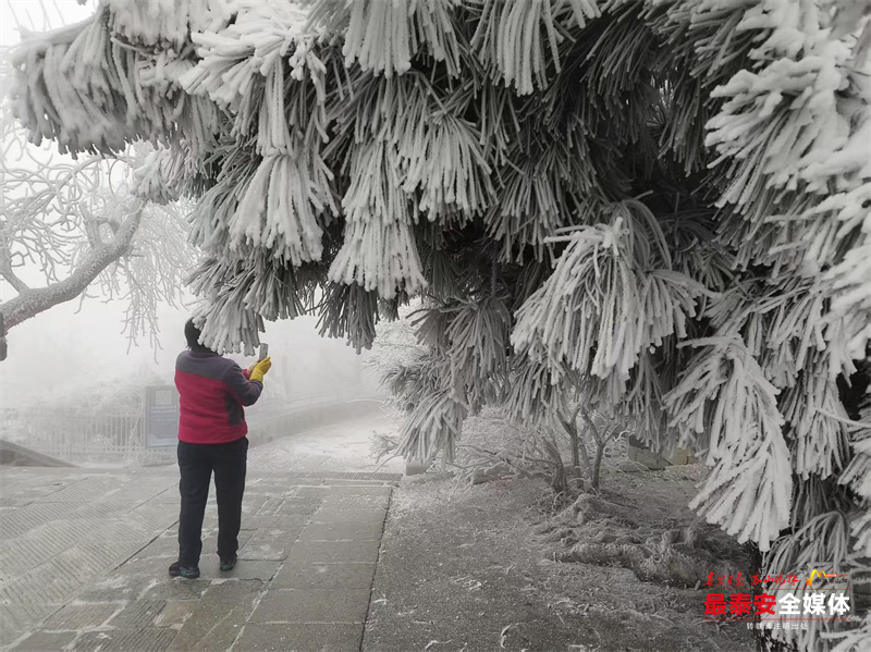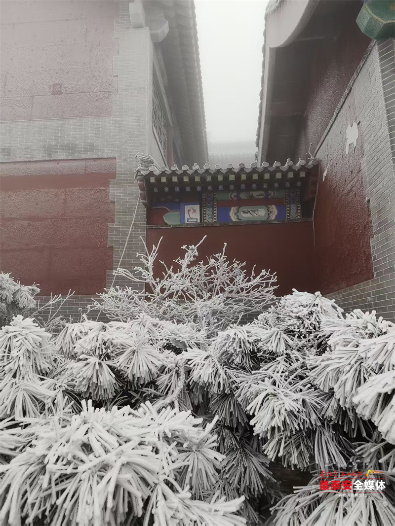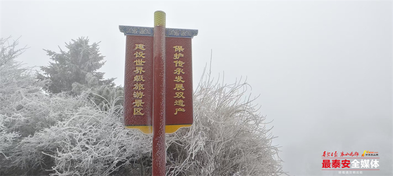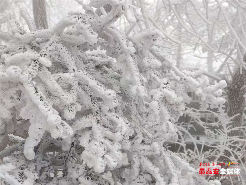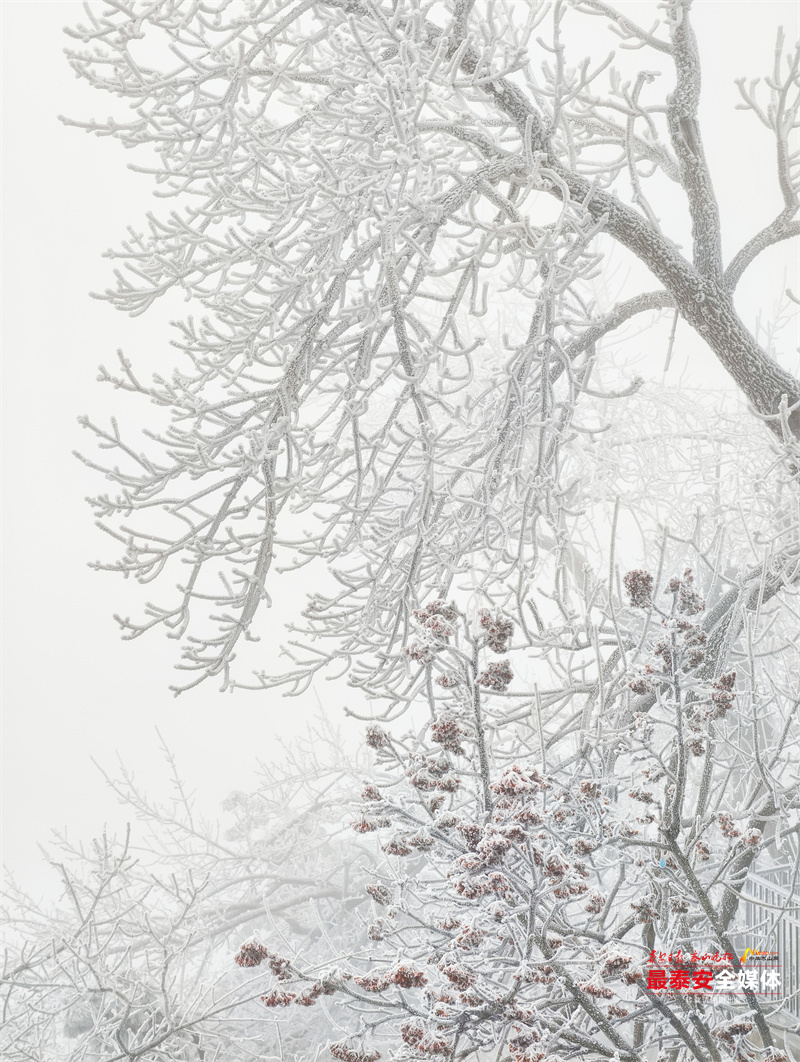 清晨时分,泰山被茫茫云雾笼罩。漫山遍野的树木、石阶乃至红墙古建,皆被冰层与霜花层层包裹,呈现出“千树万树梨花开”的壮丽景象,琼枝玉树,银装素裹。其间,红墙黛瓦的古建筑在冰雪的映衬下,更显古朴与厚重。