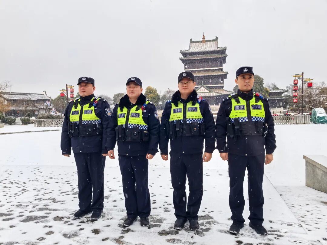 台儿庄古城一派银装素裹,美不胜收。台儿庄分局运河古城派出所全天候开展治安巡逻、交通疏导与服务保障,为游客筑起平安防线。