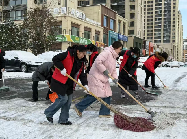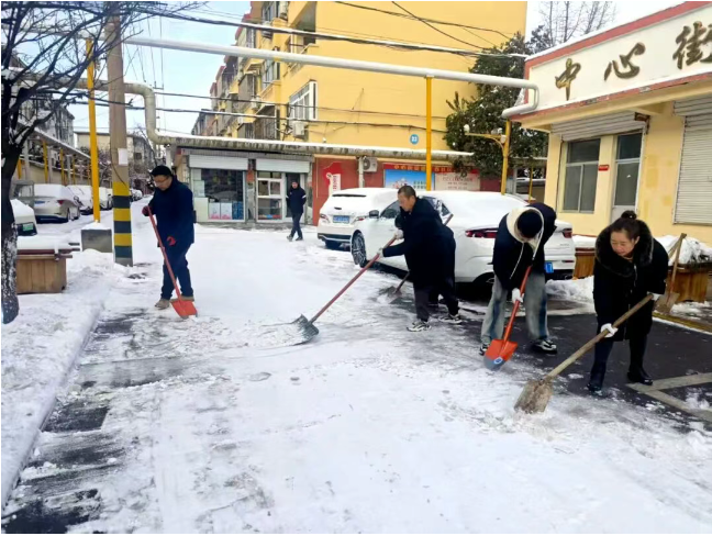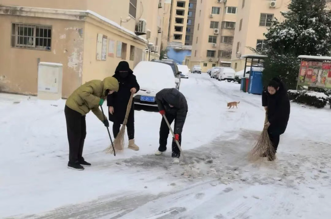龙山路街道组织干部职工和各社区对辖区和小区内重点区域进行扫雪除冰,大家分工合作,手持扫帚等铲雪工具和粗盐,有序清理道路积雪,铲除路面暗冰,打造安全出行通道,减少积雪带来的安全隐患。