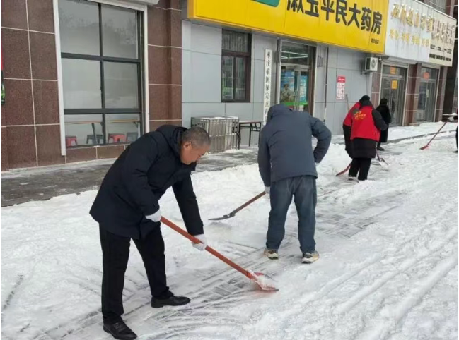 中心街街道第一时间组织党员干部、社区工作人员和志愿者迅速投入到清雪除冰工作一线,对背街小巷、人行道路、社区楼院开展清雪除冰工作,大家拿起铁锹、扫帚等工具,对各社区主路、路口等关键区域堆积的积雪进行全面清扫和铲除,居民群众的出行安全得到了有效保障。