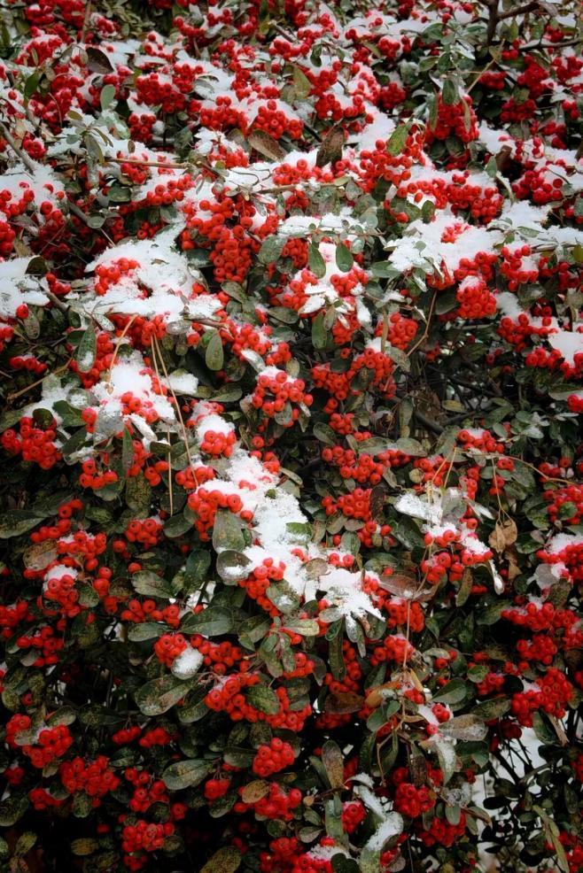 花上、叶上、树枝上都挂上了亮晶晶的雪花,