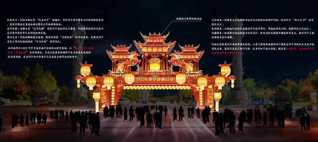 主办方把“孔孟文脉·运河灯火,福启济宁年”作为故事线,以“文化溯源——民俗共情——沉浸互动——城市展望”为脉络,把济宁的双重文化IP揉进了灯影里。景区正门的“孔孟之乡”彩灯大门,左侧立柱的题字呼应儒家发源地的身份,右侧“运河之都”的字样锚定运河文化基因,两侧的骏马造型既藏着“马到成功”的吉祥寓意,也暗合了济宁昔日作为交通枢纽的商贸记忆。