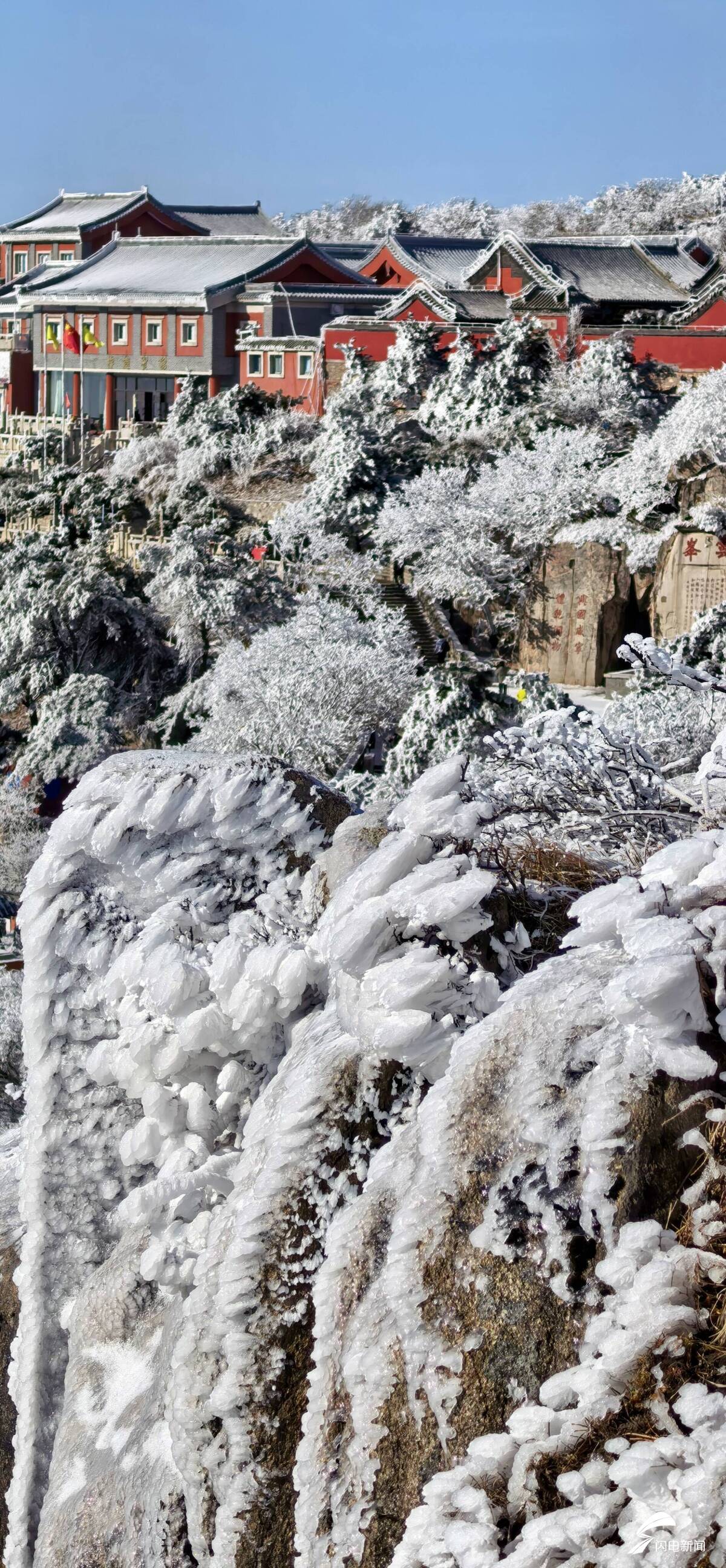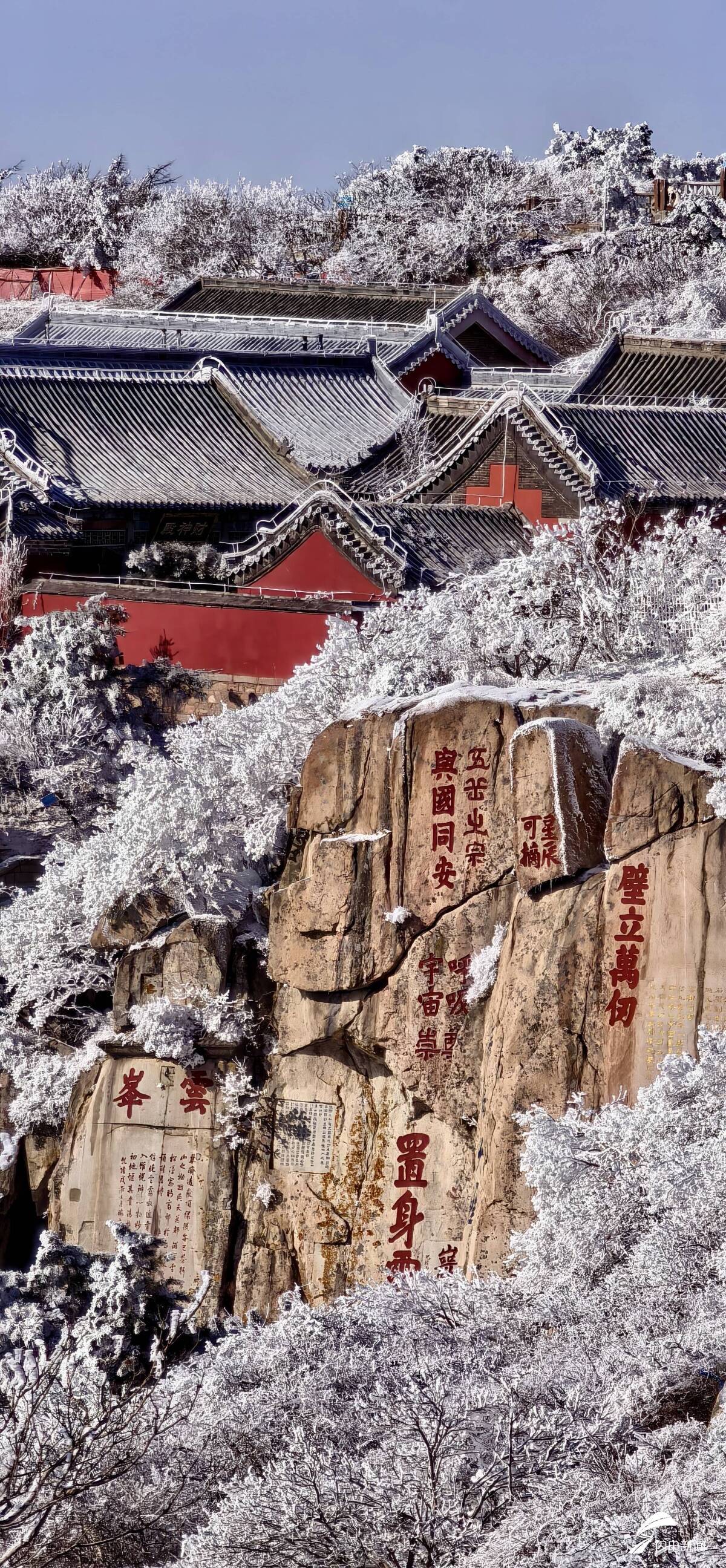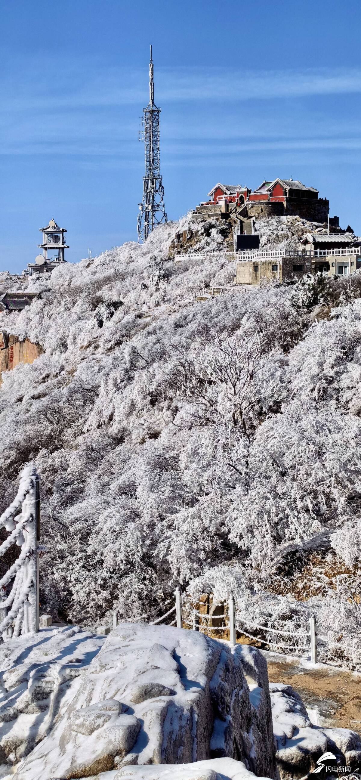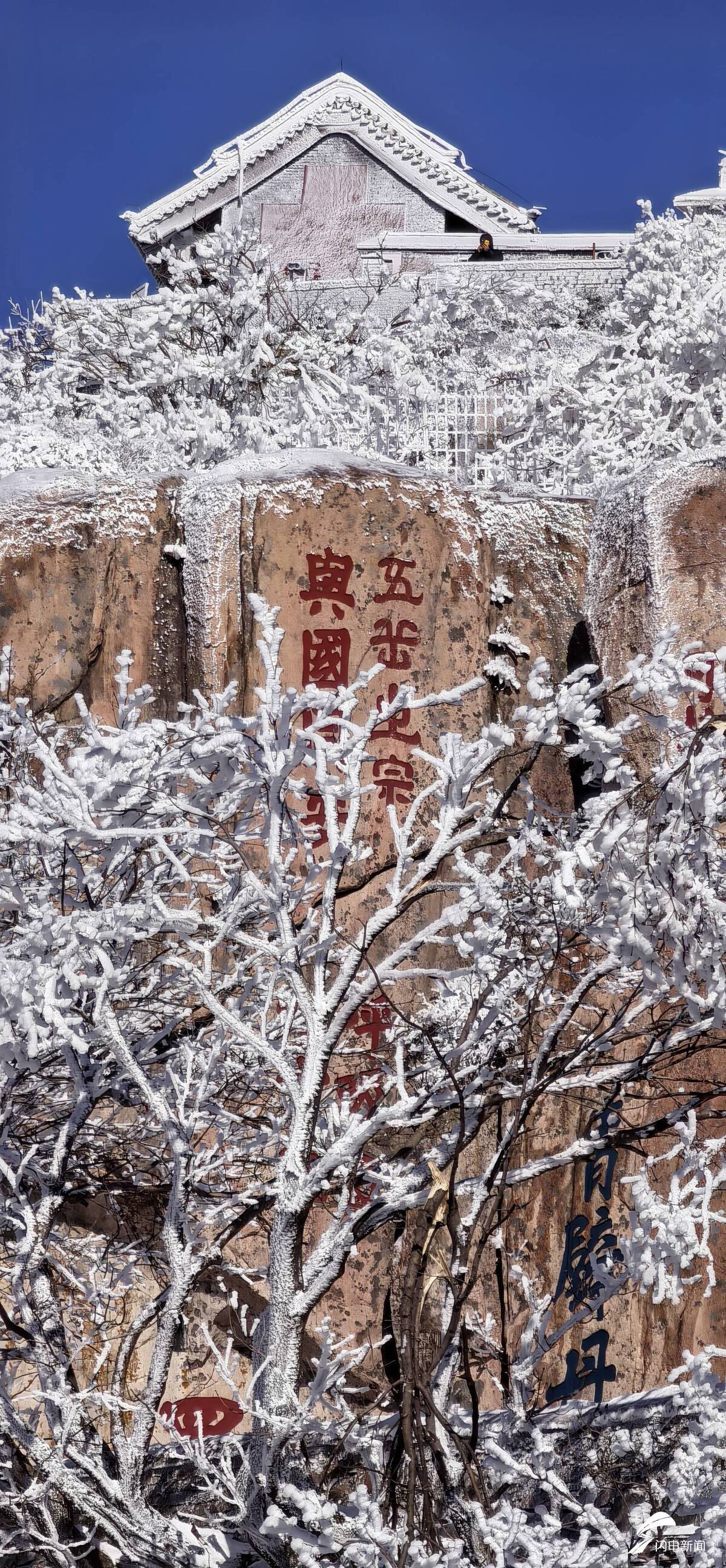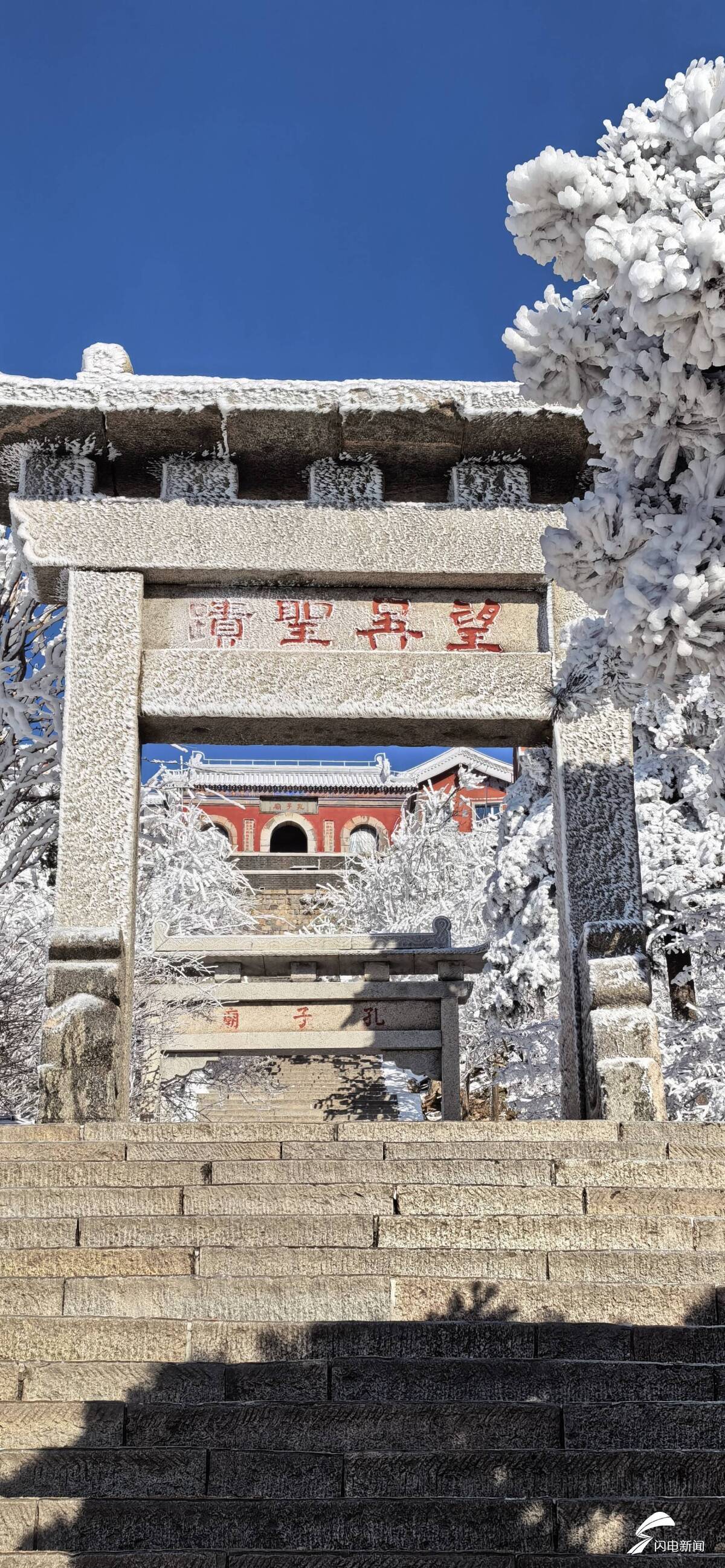 举目四望,峰峦隐在薄雾里,若隐若现,唯有这一树树雾凇,白得耀眼,美得惊心,树枝上的冰宛如透明的琉璃,在阳光下光彩夺目。石阶上积着薄雪,踩上去咯吱作响,与松涛的低吟交织在一起。偶有几只山雀掠过枝头,惊落一片碎玉,簌簌的声响里,更衬得这岱顶雪境,静谧得如同仙境。