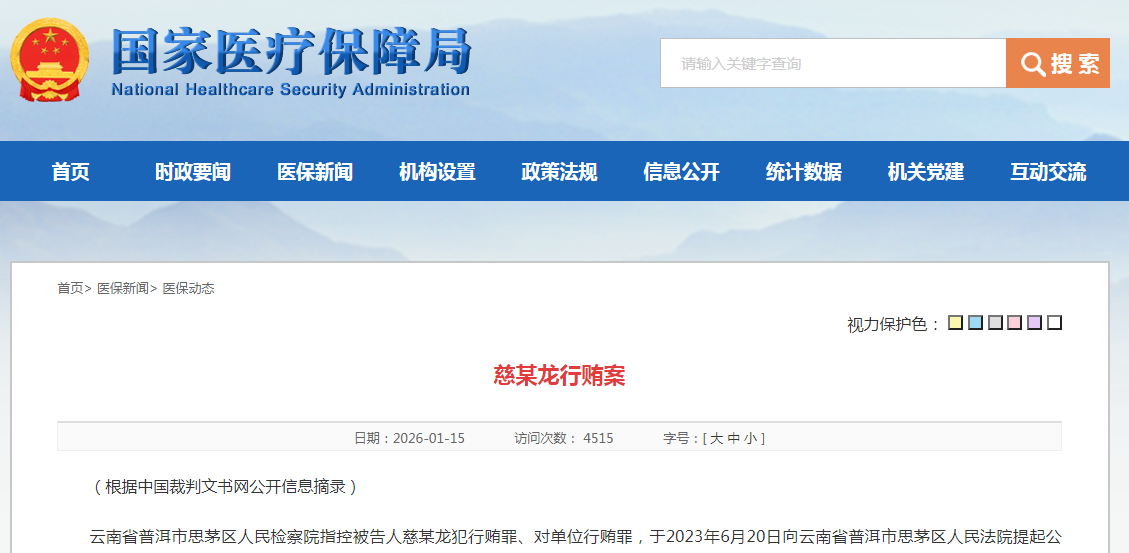 1月15日,国家医疗保障局网站公布“慈某龙行贿案”详细案情。经审理查明,被告人慈某龙为山东某某集团医用高分子制品股份有限公司昆明销售分公司业务员,向普洱市人民医院工作人员贿送现金39.5万元、美元现金9900元、200克金条一块;向普洱市人民医院内设科室贿送医用耗材销售回扣119.12万元,犯行贿罪和对单位行贿罪,被法院判处有期徒刑二年零六个月,并处罚金20万元。