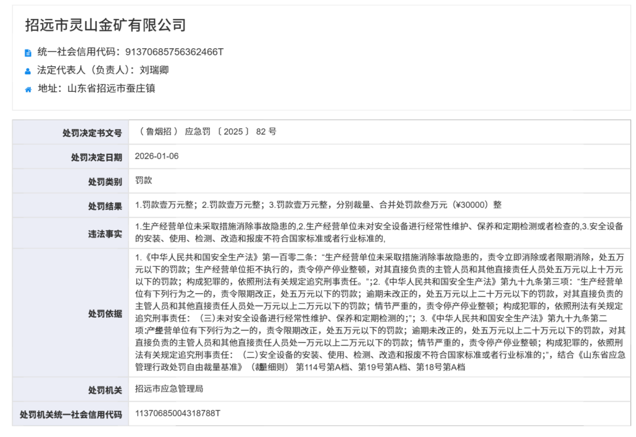 处罚决定书(鲁烟招)应急罚〔2025〕82号显示,招远市灵山金矿有限公司涉三项违法行为,包括“生产经营单位未采取措施消除事故隐患”“生产经营单位未对安全设备进行经常性维护、保养和定期检测或者检查”“安全设备的安装、使用、检测、改造和报废不符合国家标准或者行业标准”。招远市应急管理局对三项违法行为分别裁量、合并处罚,共计罚款3万元。