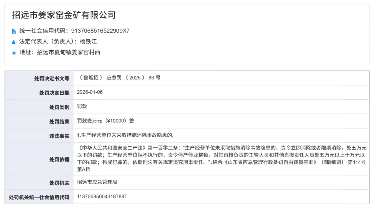 另一份处罚决定书(鲁烟招)应急罚〔2025〕83号显示,招远市姜家窑金矿有限公司因“生产经营单位未采取措施消除事故隐患”,被招远市应急管理局罚款1万元。
